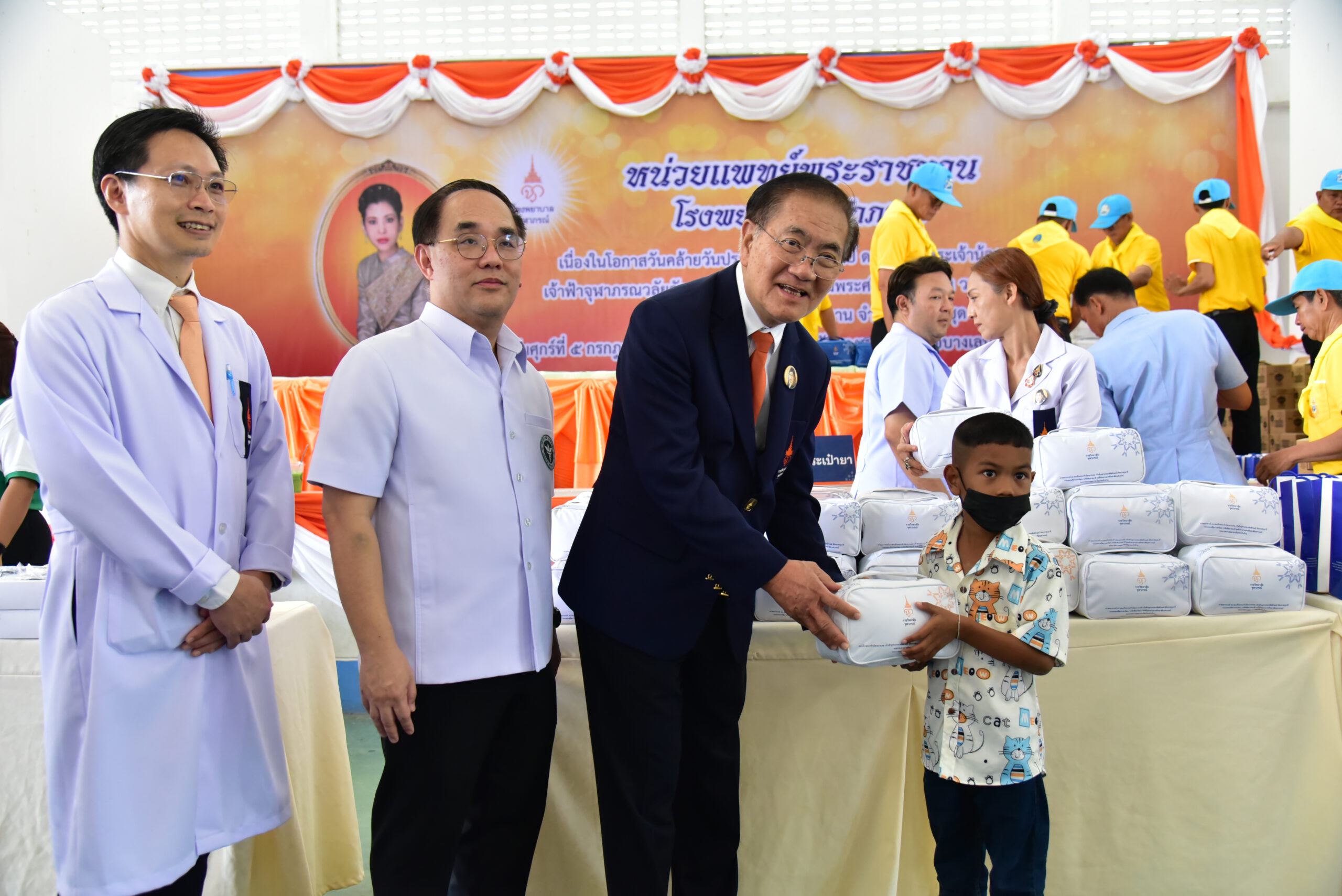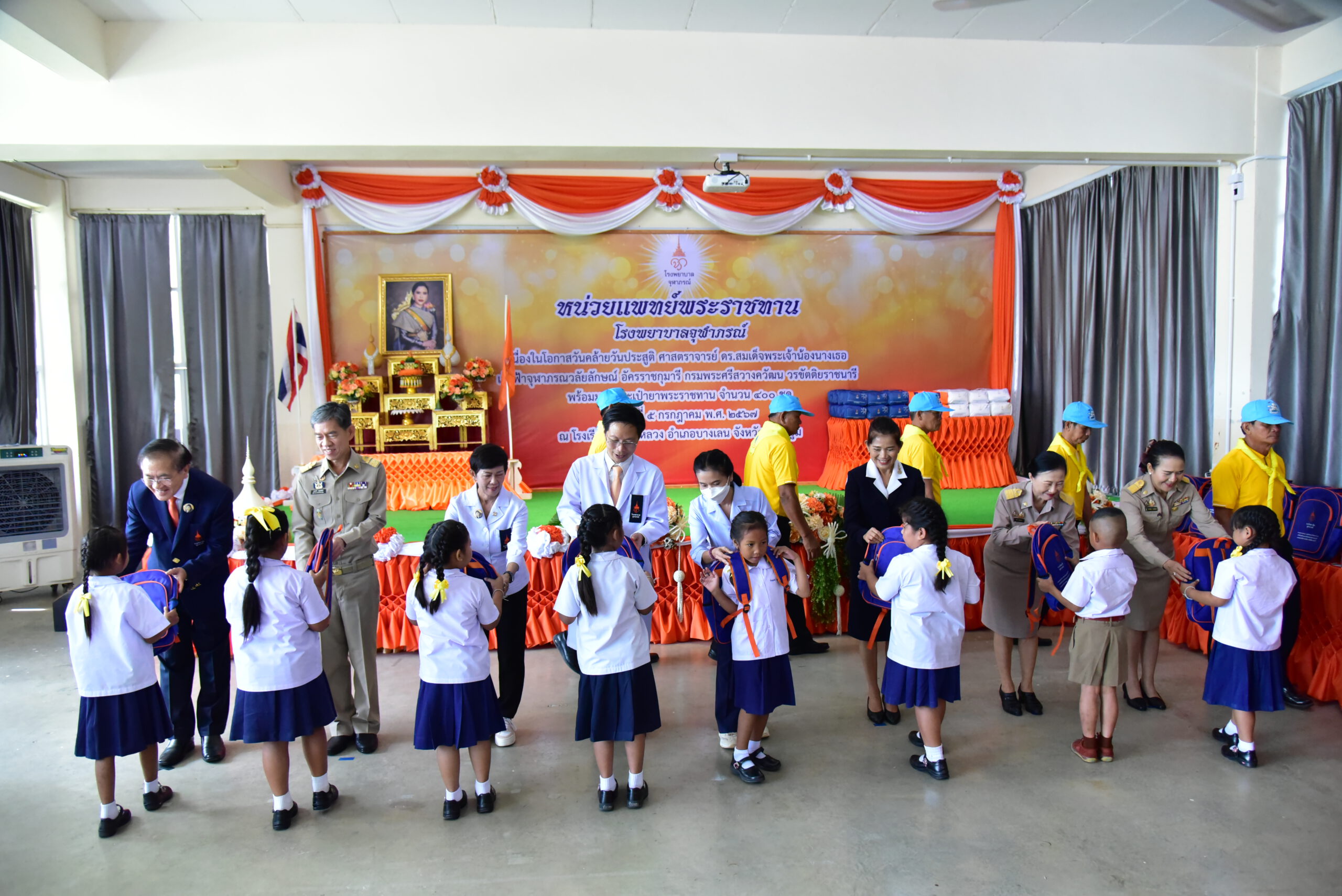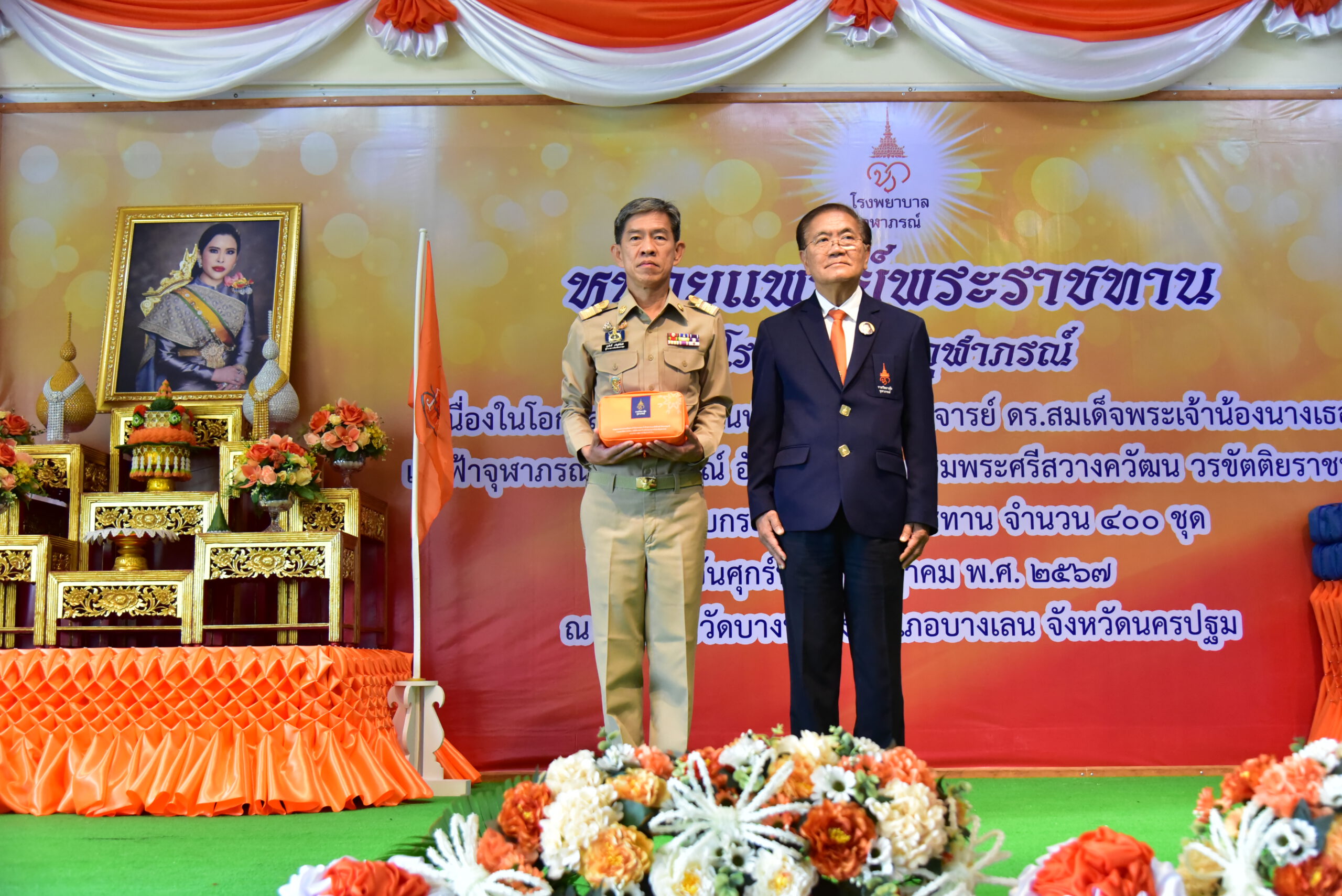วันที่ 5 กรกฎาคม พ.ศ.2567 ที่โรงเรียนวัดบางหลวง ตำบลบางหลวง อำเภอบางเลน จังหวัดนครปฐม ศาสตราจารย์เกียรติคุณ นายแพทย์รัชตะ รัชตะนาวิน รักษาการรองเลขาธิการราชวิทยาลัยจุฬาภรณ์ เป็นประธานเปิดหน่วยแพทย์พระราชทานโรงพยาบาลจุฬาภรณ์ เนื่องในวันสำคัญแห่งราชวงศ์จักรี ประจำปี 2567 วันคล้ายวันประสูติ ศาสตราจารย์ ดร.สมเด็จพระเจ้าน้องนางเธอ เจ้าฟ้าจุฬาภรณวลัยลักษณ์ อัครราชกุมารี กรมพระศรีสวางควัฒน วรขัตติยราชนารี เพื่อให้บริการตรวจรักษา พร้อมมอบกระเป๋ายาพระราชทาน จำนวน 400 ชุด แก่ประชาชนในพื้นที่อำเภอบางเลน โดยมีนายสุรศักดิ์ เจริญศิริโชติ ผู้ว่าราชการจังหวัดนครปฐม พร้อมด้วย นายกเหล่ากาชาดจังหวัด นายแพทย์สาธารณสุขจังหวัด คณะกรรมการและสมาชิกเหล่ากาชาด หัวหน้าส่วนราชการ ครู นักเรียน และประชาชน เข้าร่วมโครงการในครั้งนี้
