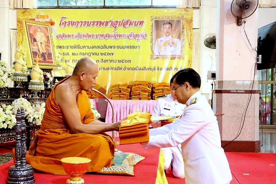 นายสุเมธ ธีรนิติ ผู้ว่าราชการจังหวัดสิงห์บุรีมอบหมายให้นายปรีชา ดิลกพรเมธี รองผู้ว่าราชการจังหวัดสิงห์บุรี เป็นประธานประกอบพิธีบรรพชาอุปสมบท โดยจังหวัดสิงห์บุรี ร่วมกับ คณะสงฆ์จังหวัดสิงห์บุรี จัดโครงการบรรพชาอุปสมบท เฉลิมพระเกียรติพระบาทสมเด็จพระเจ้าอยู่หัว เนื่องในโอกาสพระราชพิธีมหามงคลเฉลิมพระชนมพรรษา 6 รอบ 28 กรกฎาคม 2567 ณ อุโบสถกลางน้ำ วัดพระนอนจักรสีห์ วรวิหาร โดยมีหัวหน้าส่วนราชการ เจ้าหน้าที่ พนักงาน และพุทธศาสนิกชน เข้าร่วมพิธี