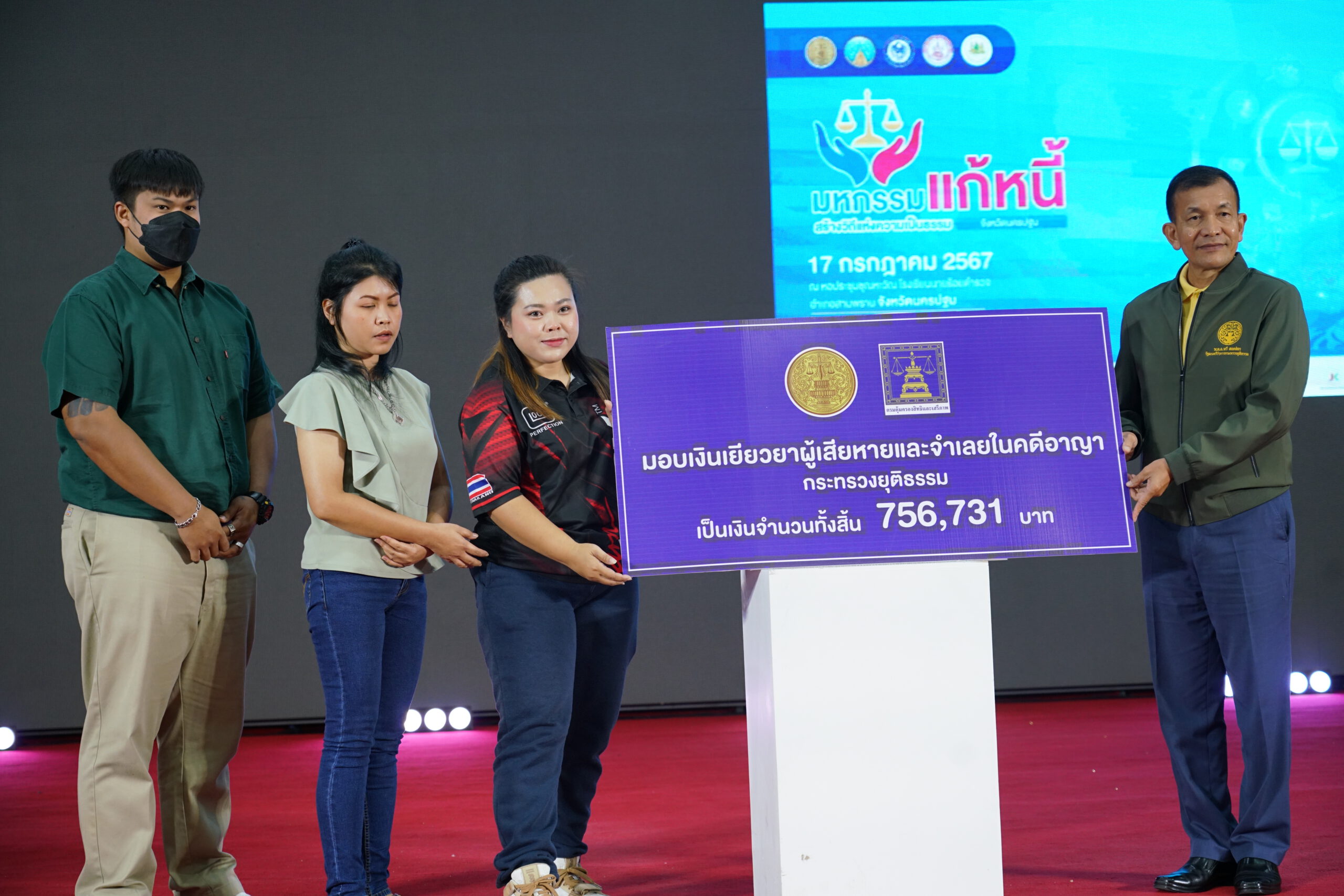 รวมทั้งมอบเงินเยียวยา ตาม พ.ร.บ.ค่าตอบแทนผู้เสียหายและค่าทดแทนแก่จำเลยในคดีอาญา พ.ศ. 2544และที่แก้ไขเพิ่มเติม (ฉบับที่ 2) พ.ศ. 2559จำนวน 3ราย เงินเยียวยา 756,731บาท และพิธีมอบป้ายศูนย์ไกล่เกลี่ยข้อพิพาทภาคป ระชาชนในพื้นที่จังหวัดนครปฐม จำนวน 22ศูนย์