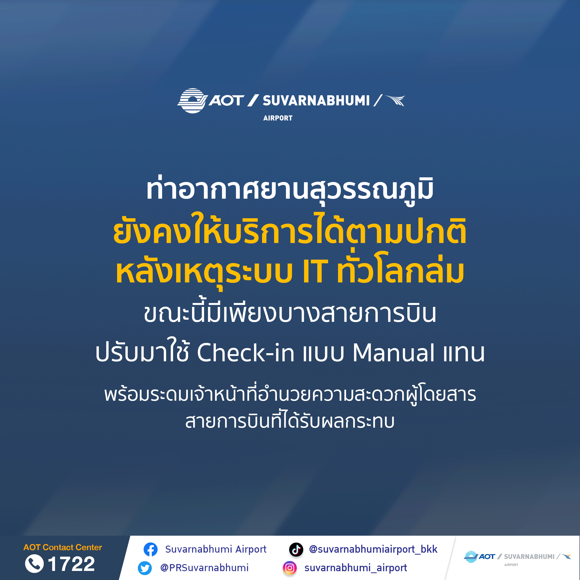 *****วันที่ 19 กรกฎาคม 2567 นายกิตติพงศ์ กิตติขจร ผู้อำนวยการท่าอากาศยานสุวรรณภูมิ เปิดเผยว่า จากกรณีระบบปฏิบัติการของ Microsoft ล่มทั่วโลก ส่งผลกระทบต่อการให้บริการของสายการบินและสนามบินในหลายประเทศ ตั้งแต่เวลาประมาณ 14.00 น. ตามเวลาประเทศไทย ในวันที่ 19 กรกฎาคม 2567 นั้น ท่าอากาศยานสุวรรณภูมิ (ทสภ.) ได้ดำเนินการตรวจสอบระบบของสนามบินอย่างละเอียดแล้ว พบว่าไม่ได้รับผลกระทบจากเหตุการณ์ดังกล่าว ขณะนี้เวลา 19.00 น. มีเพียง 3 สายการบินที่ประสบปัญหาในการใช้ระบบเช็กอิน ได้แก่ สายการบินไทยแอร์เอเชียเอ็กซ์ สกู๊ตแอร์ และสายการบินอินดิโก้ ซึ่งทั้ง 3 สายการบิน ได้ปรับเปลี่ยนมาใช้ระบบเช็กอินแบบ Manual แทน จากเหตุการณ์ดังกล่าวส่งผลให้มีผู้โดยสารรอคิวเช็กอินเป็นจำนวนมาก ทสภ. จึงได้ระดมเจ้าหน้าที่เข้าช่วยเหลือและอำนวยความสะดวกผู้โดยสารที่บริเวณเคาน์เตอร์เช็กอินของสายการบินที่ได้รับผลกระทบ