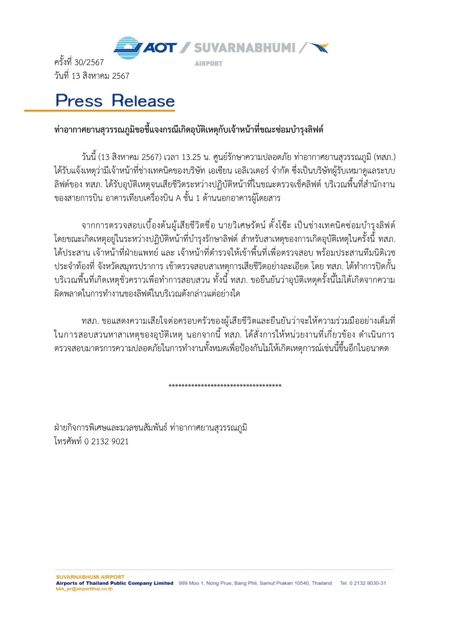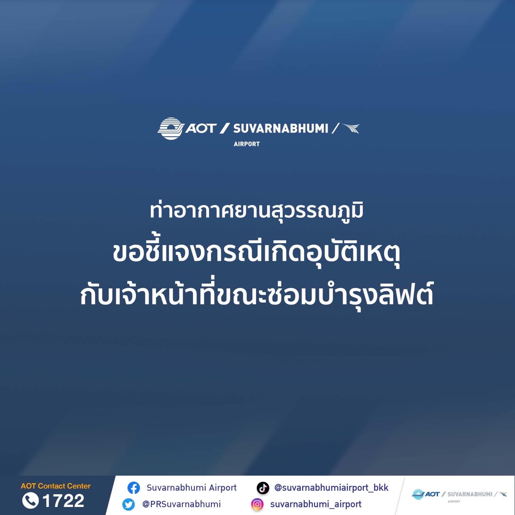 ท่าอากาศยานสุวรรณภูมิขอชี้แจงกรณีเกิดอุบัติเหตุกับเจ้าหน้าที่ขณะซ่อมบำรุงลิฟต์