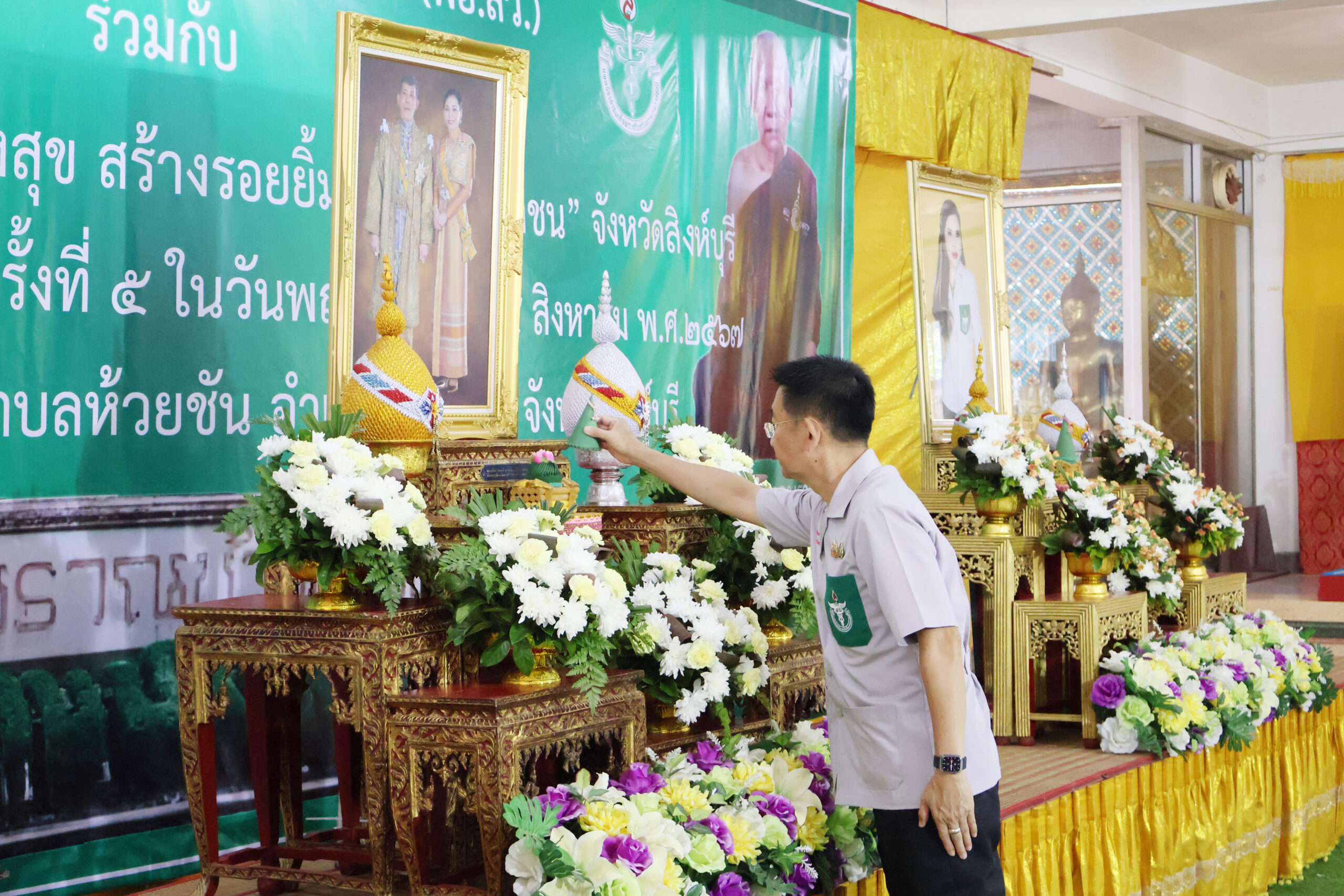 ซึ่งได้มอบเครื่องอุปโภค-บริโภค แก่ผู้สูงอายุ ผู้พิการ และผู้ยากไร้ จากเหล่ากาชาดจังหวัดสิงห์บุรี จำนวน 100 ชุด และมอบแว่นสายตายาวให้แก่สูงอายุ/ผู้ยากไร้ จำนวน 500 อัน และสำนักงานพัฒนาชุมชนจังหวัดสิงห์บุรี ได้มอบทุนในกองทุนพัฒนาเด็กชนบทในพระราชูปถัมภ์จังหวัดสิงห์บุรี จำนวน 10 ทุนๆละ 1,000 บาท สำนักงานพัฒนาสังคมและความมั่นคงของมนุษย์ฯ มอบเงินสงเคราะห์เด็ก จำนวน 20 ครอบครัวๆละ 1,000 บาท พร้อมได้ตรวจเยี่ยมหน่วยแพทย์อาสาสมเด็จพระราชชนนี (พอ.สว.) และหน่วยงานที่ออกบริการประชาชน ทั้งนี้ ได้สักระพระพุทธรูป และปลูกต้นไม้ ณ วัดหนองสุ่ม ตำบลห้วยชันอำเภออินทร์บุรี จังหวัดสิงห์บุรี