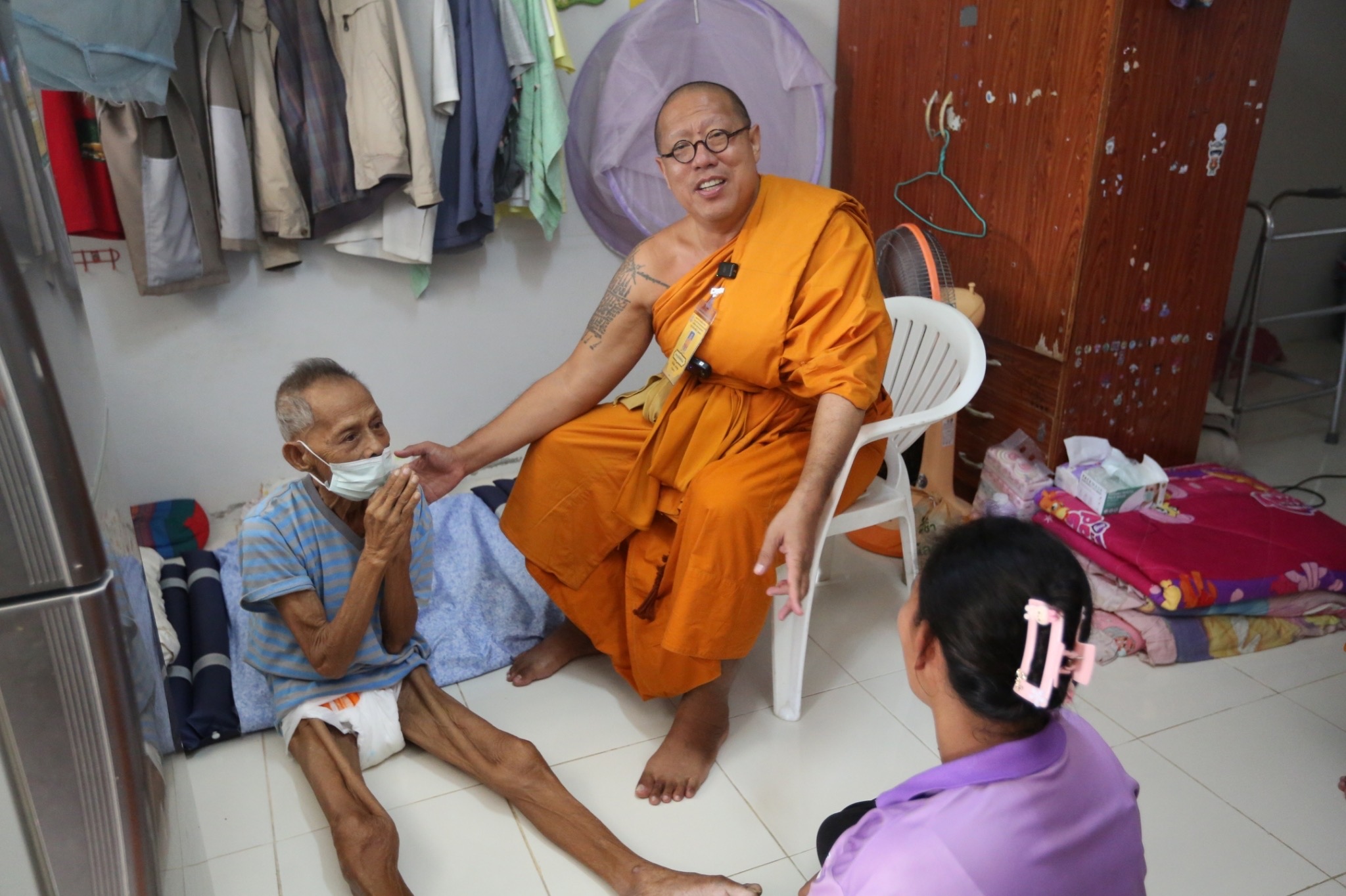 หลวงพี่น้ำฝน เจ้าอาวาสวัดไผ่ล้อม ได้สอบถามข้อมูลเพิ่มเติมจากบุตรสาว ทราบว่า นายภัคตร์ บิดา เพิ่งมีอาการป่วยด้วยโรคเก๊าและอ่อนแรง โดยมีการหายใจไม่สะดวก และเข้ารับการรักษาตัวที่โรงพยาบาลนครปฐม ก่อนจะได้รับการอนุญาตให้กลับบ้านมาดูแลต่อด้วยการกายภาพและให้รับประทานยาที่บ้านพัก โดยมีบุตรสาวคอยเป็นผู้ดูแลอย่างใกล้ชิด จากนั้นได้นำเตียงสำหรับผู้ป่วยติดตั้งภายในบ้าน ก่อนจะมอบข้าวสารและน้ำดื่ม พร้อมกับมอบเงินเป็นทุนสำหรับการซื้ออุปกรณ์ที่จำเป็นในการพักฟื้นร่างกาย