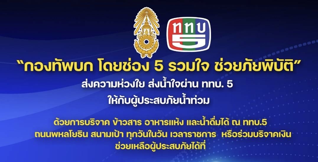 กองทัพบก โดย ททบ.5 ขอเชิญร่วมบริจาคสิ่งของเพื่อช่วยเหลือผู้ประสบอุทกภัย โดยบริจาคได้ที่บริเวณชั้น G อาคารเบญจรังสฤษฎ์ ททบ. หรือสามารถโอนเงินบริจาคเข้าบัญชี ธนาคารทหารไทยธนชาติ จำกัด (มหาชน) บัญชีออมทรัพย์ ชื่อบัญชี “ททบ.ร่วมใจช่วยเหลือภัยพิบัติ” เลขที่ 021-7-57698-2