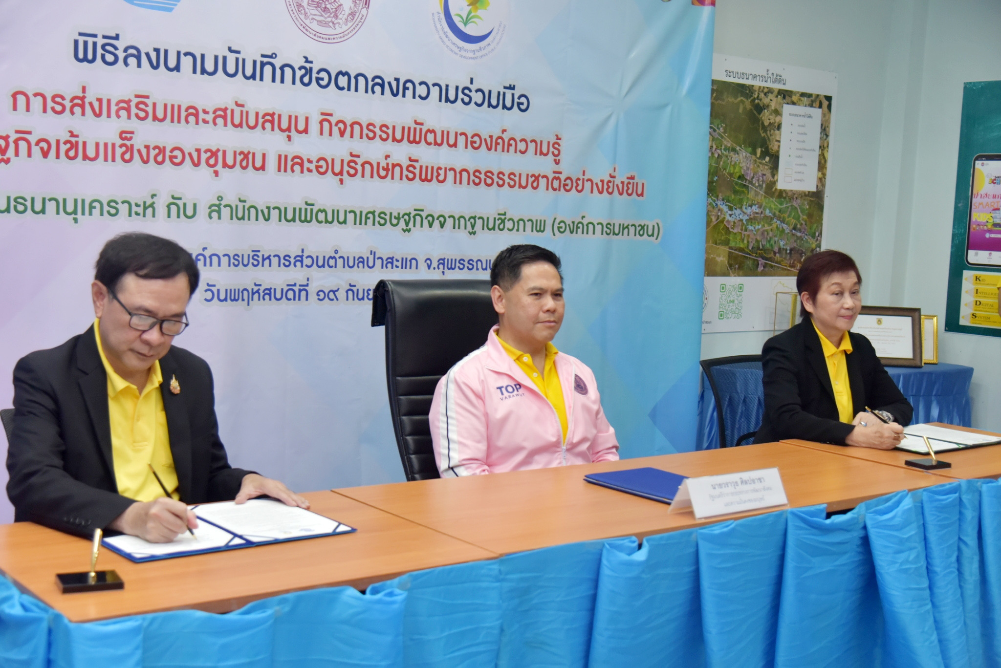 จากนั้นนายวราวุธ ศิลปอาชา รัฐมนตรีว่าการกระทรวงกาลพัฒนาสังคมและความมั่นคงของมนุษย์ ได้เป็นสักขีพยานในพิธีลงนามบันทึกข้อตกลงความร่วมมือการส่งเสริมและสนับสนุน กิจกรรมพัฒนาองค์ความรู้สร้างเศรษฐกิจเข้มแข็งของชุมชน และอนุรักษ์ทรัพยากรธรรมชาติอย่างยั่งยืนระหว่าง สำนักงานธนานุเคราะห์ กับ สำนักงานพัฒนาเศรษฐกิจจากฐานชีวภาพ (องค์การมหาชน) โดยนายประสงค์ พันธ์ลิมา ผู้อำนวยการสำนักงานธนานุเคราะห์ และนางสุวรรณา เตียรถ์สุวรรณ ผู้อำนวยการสำนักงานพัฒนาเศรษฐกิจจากฐานชีวภาพ เป็นผู้ลงนาม ณ องค์การบริหารส่วนตำบลป่าสะแก