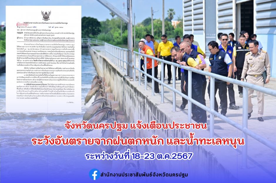 จังหวัดนครปฐม แจ้งเตือนประชาชนระวังอันตรายจากฝนตกหนัก และน้ำทะเลหนุน ระหว่างวันที่ 18-23 ต.ค.2567