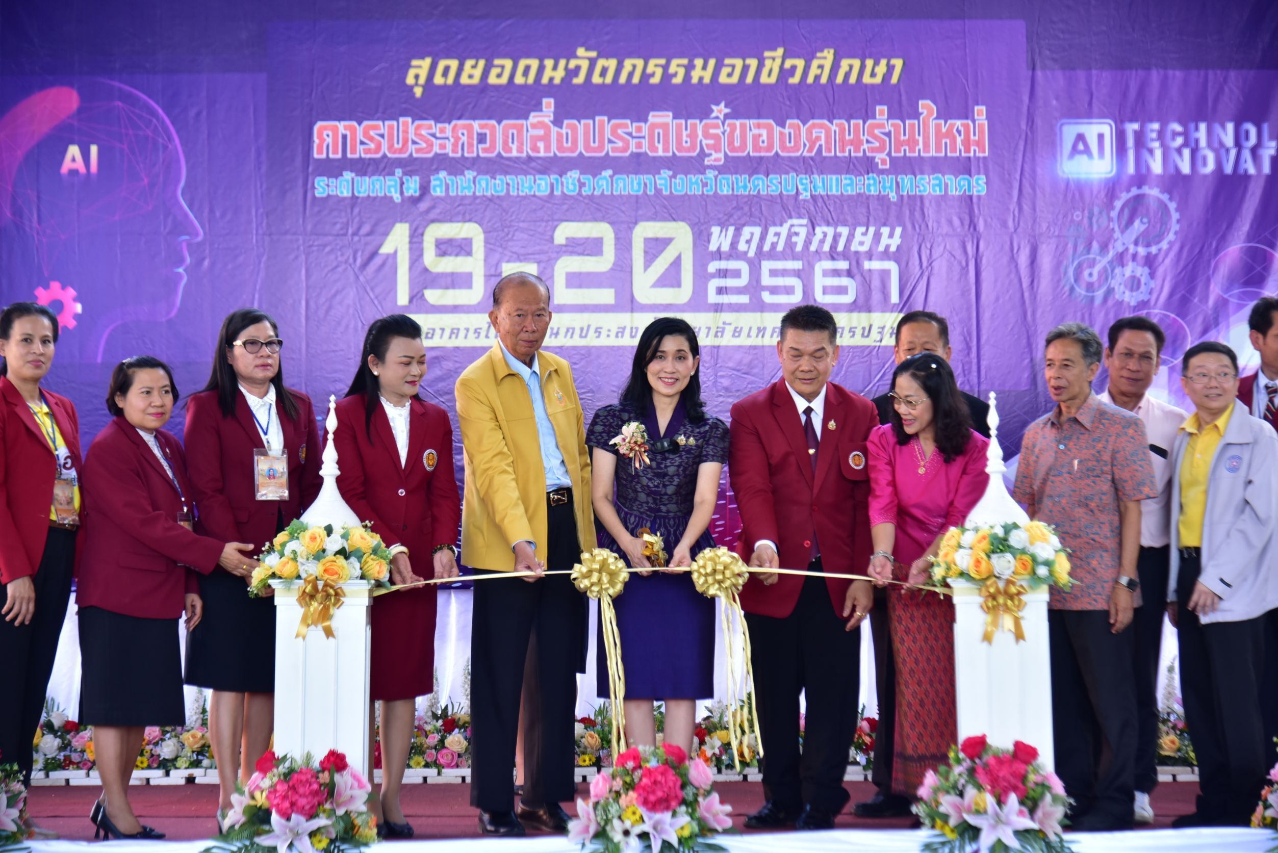เมื่อวันที่ 19 พฤศจิกายน 2567 เวลา 10.00 น. ที่อาคารอเนกประสงค์ วิทยาลัยเทคนิคนครปฐม นางสาวอโรชา นันทมนตรี รองผู้ว่าราชการจังหวัด รักษาราชการแทนผู้ว่าราชการจังหวัดนครปฐม เป็นประธานเปิดการประกวดสิ่งประดิษฐ์ของคนรุ่นใหม่ ประจำปีการศึกษา 2568 “สุดยอดนวัตกรรม อาชีวศึกษา” ระดับกลุ่ม สำนักงานอาชีวศึกษาจังหวัดนครปฐม และสมุทรสาคร โดยว่าที่ร้อยตรี ดร.ชนะคมศร คงยืน ผู้อำนวยการวิทยาลัยเทคนิคนครปฐม ปฏิบัติหน้าที่ผู้อำนวยการสำนักงานอาชีวชีวศึกษาจังหวัดนครปฐม กล่าวว่า ตามที่สำนักงานคณะกรรมการการอาชีวศึกษา มีนโยบายในด้านพัฒนาคุณภาพการเรียนการสอนผู้เรียนอาชีวศึกษา เป็นการยกระดับคุณภาพอาชีวศึกษา