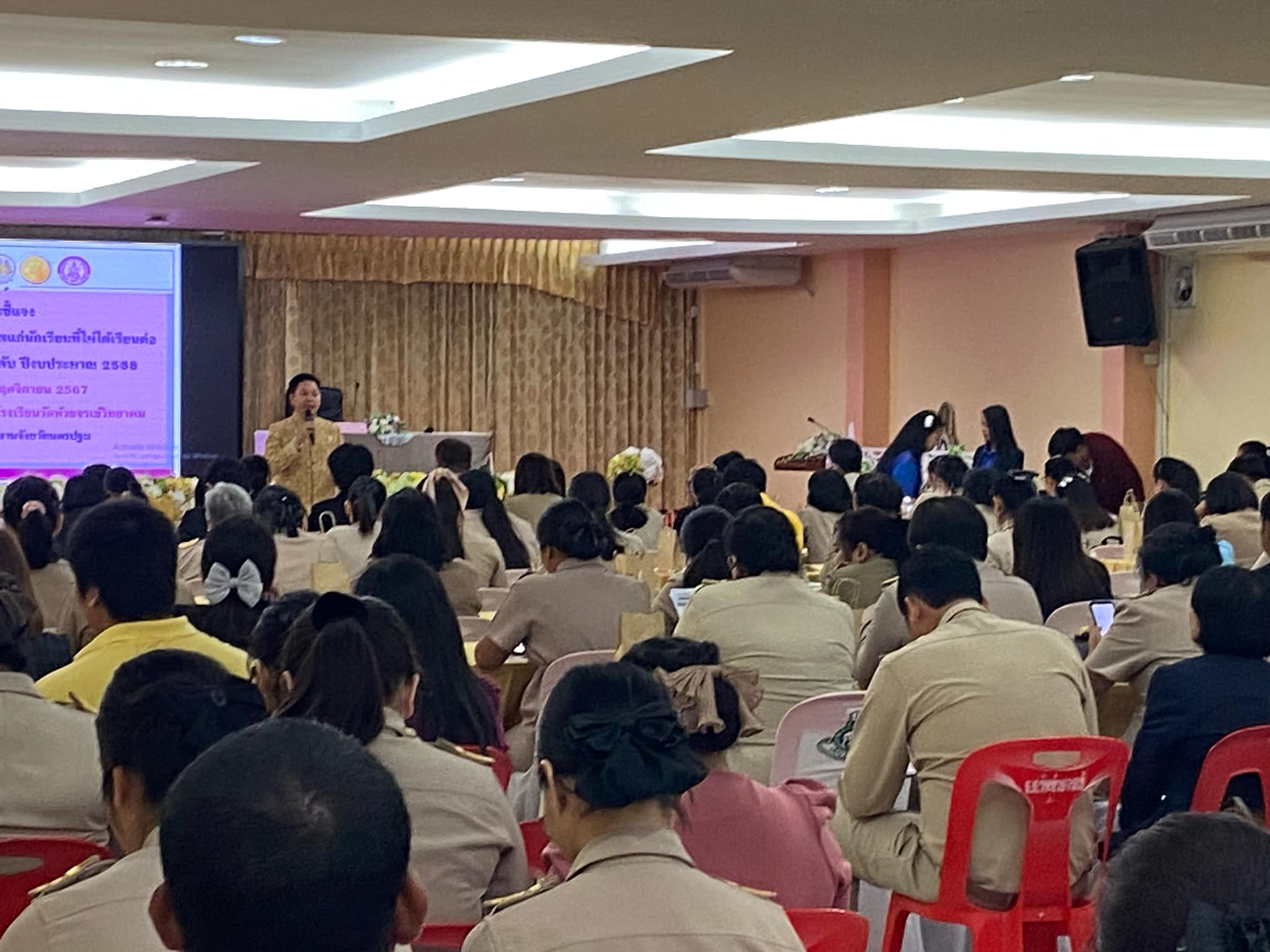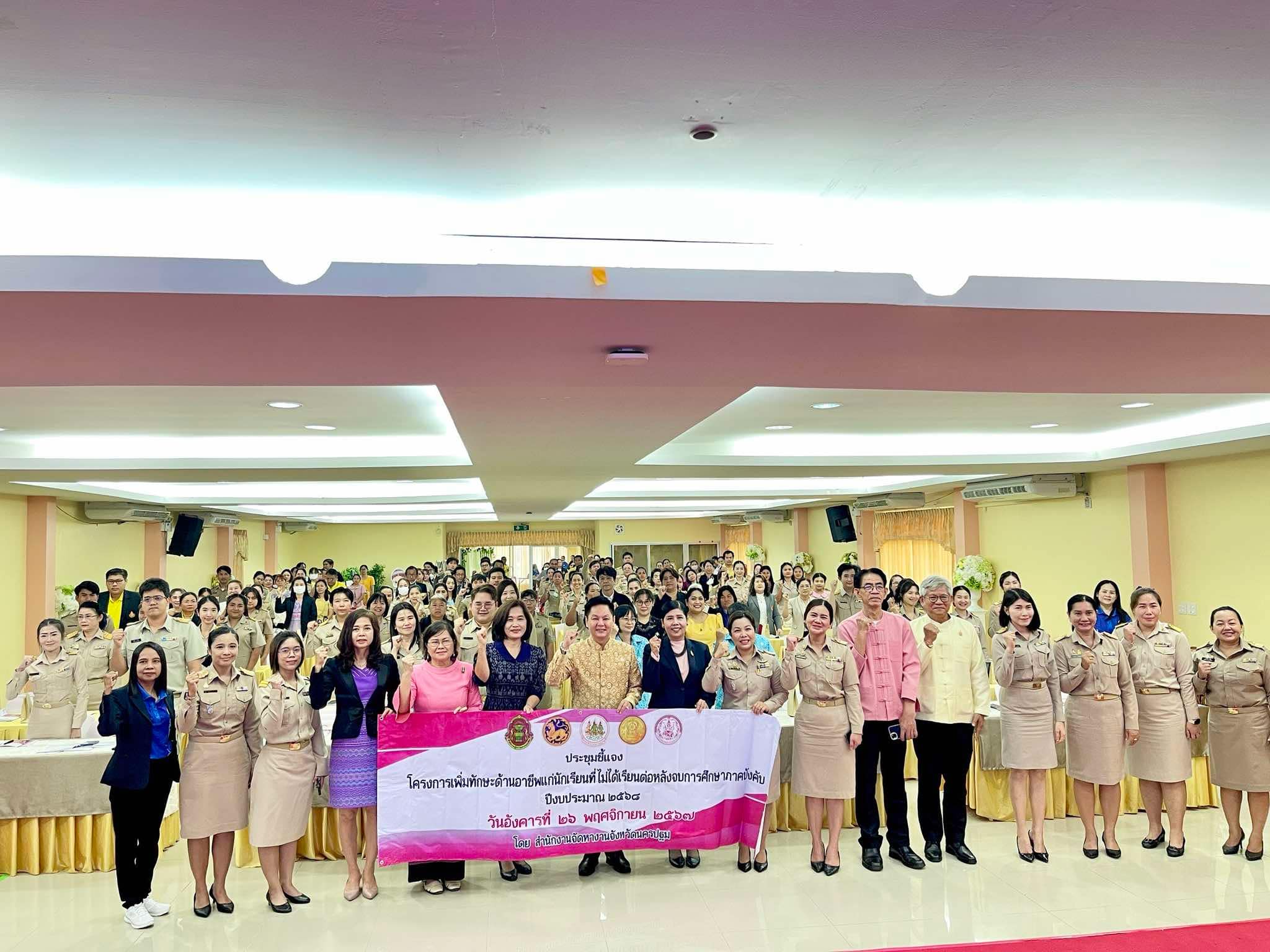 วันที่ 26 พฤศจิกายน 2567 เวลา 09.00 น. ที่ห้องประชุมอาคาร 70 ปี ไทยประกันชีวิต วานิชไชยวรรณ โรงเรียนวัดห้วยจรเข้วิทยาคม อำเภอเมือง จังหวัดนครปฐม นายอรรถวุฒิ พึ่งเนียม รองผู้ว่าราชการจังหวัดนครปฐม เป็นประธานเปิดโครงการเตรียมความพร้อมแก่กลุ่มเป้าหมายก่อนเข้าสู่ตลาดแรงงาน กิจกรรมประชุมชี้แจงให้ความรู้เรื่องโครงการเพิ่มทักษะด้านอาชีพแก่นักเรียนที่ไม่ได้เรียนต่อหลังจบการศึกษาภาคบังคับ ประจำปีงบประมาณ พ.ศ. 2568
