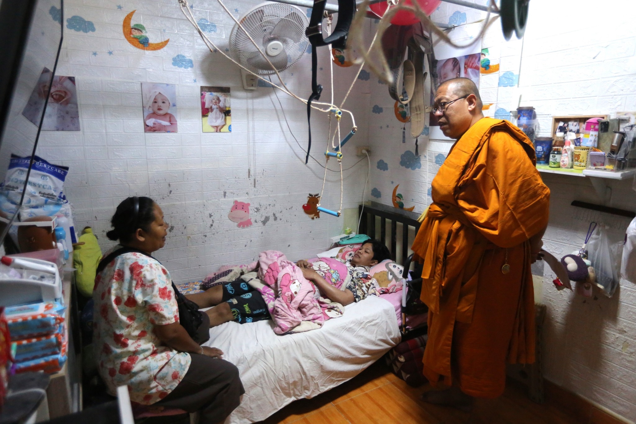 “ปกติแม่เคยมาที่วัดไผ่ล้อมตั้งแต่ลูกลูกยังเด็ก เห็นหลวงพี่น้ำฝนมานาน ซึ่งได้ติดตามภารกิจการช่วยเหลือคนโดยเฉพาะการมอบเตียงไฟฟ้าให้กับโรงพยาบาลนครปฐม ในใจก็คิดว่าอยากจะประสานขอรถวีลแชร์แบบอาบน้ำให้ลูกซักคันเนื่องจาก หนองบัว ไม่สามารถลุกไปเข้าห้องน้ำเองได้จะต้องจับใส่รถเข็นเพื่อเข็นเข้าไปอาบน้ำในห้องน้ำ และได้เห็นจากเพจ “คิดไม่ออกบอกหลวงพี่น้ำฝน” ว่ามีการช่วยเหลือมอบเตียงผู้ป่วย และรถวีลแชร์ จึงได้ส่งข้อความ อินบ็อกซ์ ไปขอ ซึ่งก็มีการตอบรับทันที และเช้าวันรุ่งขึ้นหลวงพี่น้ำฝนก็มาเองโดยเอารถวีลแชร์มาให้ถึงสองคัน รวมถึงเงินยังชีพอีก 2000 บาท ทำให้รู้สึกประทับใจและไม่คิดว่าจะได้รับการช่วยเหลือได้รวดเร็วขนาดนี้” นางสาวชลดา กล่าว