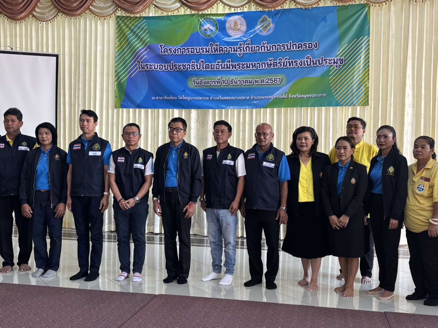 เมื่อเวลา 10.00น.วันที่ 10 ธันวาคม 2567ที่ วัดใหญ่บางปลากด ตำบลในคลองบางปลากด อำเภอพระสมุทรเจดีย์ จังหวัดสมุทรปราการ นายแสวง บุญมี เลขาธิการคณะกรรมการการเลือกตั้ง เป็นประธานในพิธีเปิดโครงการอบรมให้ความรู้เกี่ยวกับการปกครองในระบอบประชาธิปไตย อันมีพระมหากษัตริย์ทรงเป็นประมุข แก่ประชาชนในตำบลในคลลองบางปลากด โดยมี นายวันชัย โชควิเศษชัยสิทธิ์ ผู้อำนวยการสำนักงานคณะกรรมการการเลือกตั้ง ประจังหวัดสมุทรปราการ ในนามศูนย์ส่งเสริมพัฒนาประชาธิปไตยตำบลในคลองบางปลากด กล่าวรายงาน นายหนึ่งสกล ธเนศตระกูล นายกองค์การบริหารส่วนตำบลในคลองบางปลากด กล่าวต้อนรับ นาย วีระ ยี่แพร รองเลขาธิการคณะกรรมการการเลือกตั้ง น.ส. พัชรินทร์ รัตนวิภา ผู้ตรวจการ เขตตรวจการที่ 1 สนง.กกต. น.ส.บุญเรือน ไทยวัฒนธรรม ผอ.สำนักประชาสัมพันธ์ นายหงษา เทพพิชัย ผอ.ศูนย์ส่งเสริมการมีส่วนร่วมของพลเมืองที่ 1 ร่วมงาน