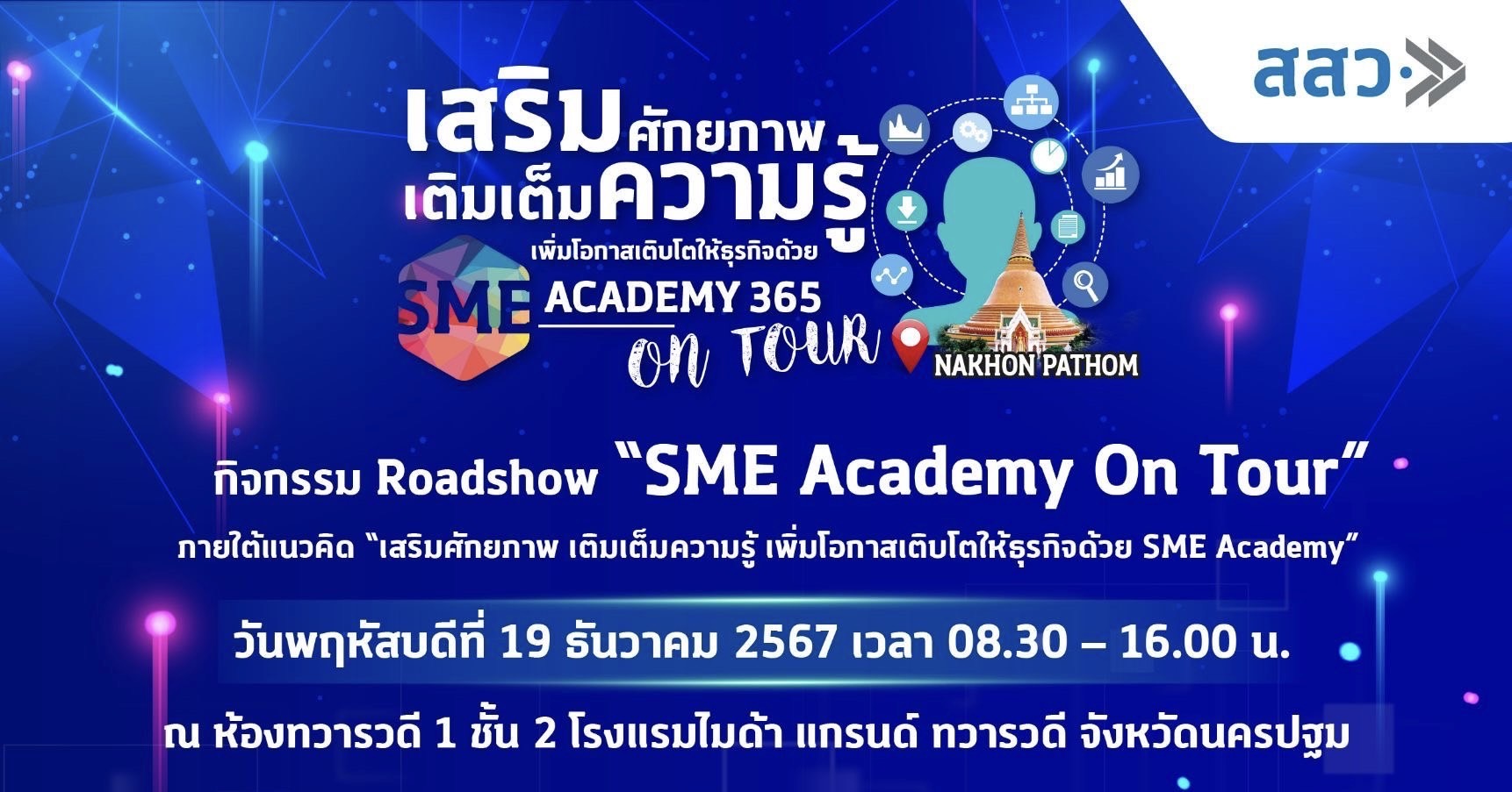 สำนักงานส่งเสริมวิสาหกิจขนาดกลางและขนาดย่อม (สสว.) เตรียมพร้อมจัดเต็มกับกิจกรรม Roadshow “SME Academy On Tour” ครั้งที่ 11 จ.นครปฐม ภายใต้แนวคิด “เสริมศักยภาพ เติมเต็มความรู้ เพิ่มโอกาสเติบโตให้ธุรกิจด้วย SME Academy 365” โดยมุ่งเน้นส่งเสริมให้ผู้ประกอบการ SME และผู้สนใจในจังหวัดนครปฐมและพื้นที่ใกล้เคียงได้ร่วมเรียนรู้ธุรกิจฟรี กับ academy 365 เสริมศักยภาพ SME ให้ธุรกิจเติบโตยุคดิจิทัล ในวันพฤหัสบดีที่ 19 ธันวาคม 2567 ณ ห้องทวารวดี 1 ชั้น 2 โรงแรมไมด้า แกรนด์ ทวารวดี จังหวัดนครปฐม