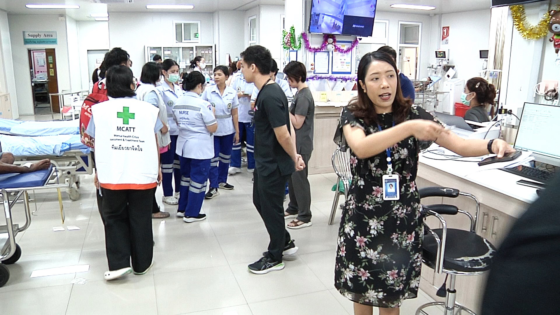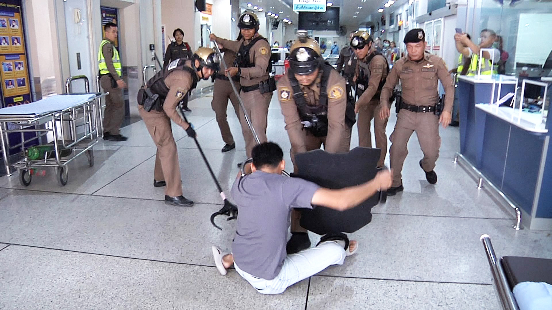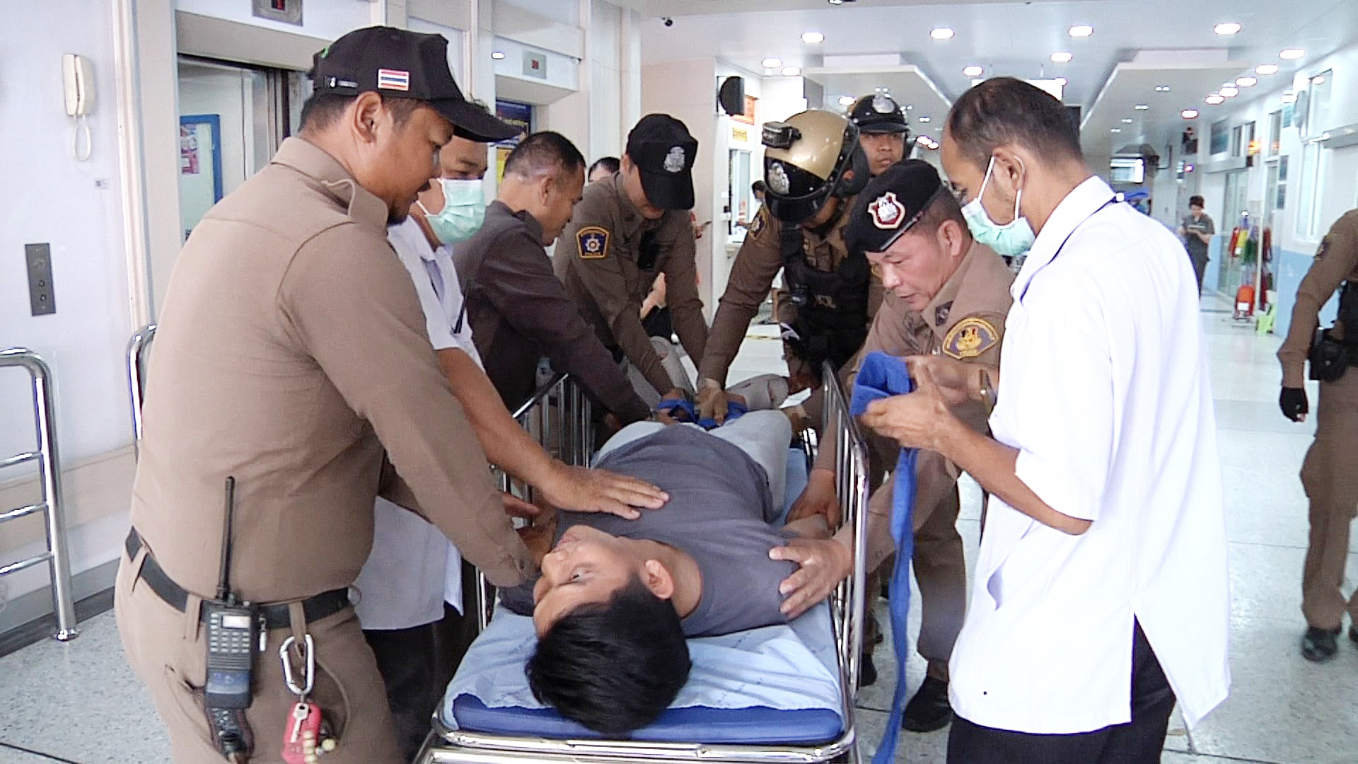 จากนั้นได้ประสานเจ้าหน้าที่ตำรวจ นำอุปกรณ์เหล็กง่ามพิฆาต ที่ใช้สำหรับควบคุมผู้ที่มีอาการคลุ้มคลั่งไม่ให้ก่อเหตุสร้างความเสียหายและคุมตัว หลังจากควบคุมเหตุการณ์ได้ก็ให้เจ้าหน้าที่ รปภ. เจ้าหน้าที่เวรเปล และพยาบาล ช่วยกันใช้เชือกผ้าผูกแขน ผูกขา ล็อกตัวเพื่อความปลอดภัย ก่อนนำตัวเข้าห้องฉุกเฉิน ฉีดยานอนหลับตามขั้นตอน หลังจากนั้นก็จะมีทีมประเมินความเสียหาย ทีม MCATT