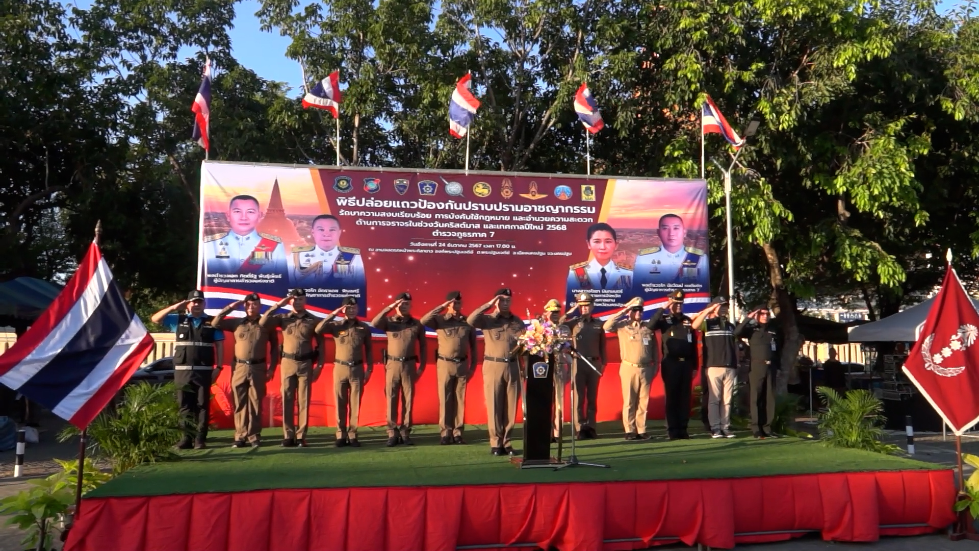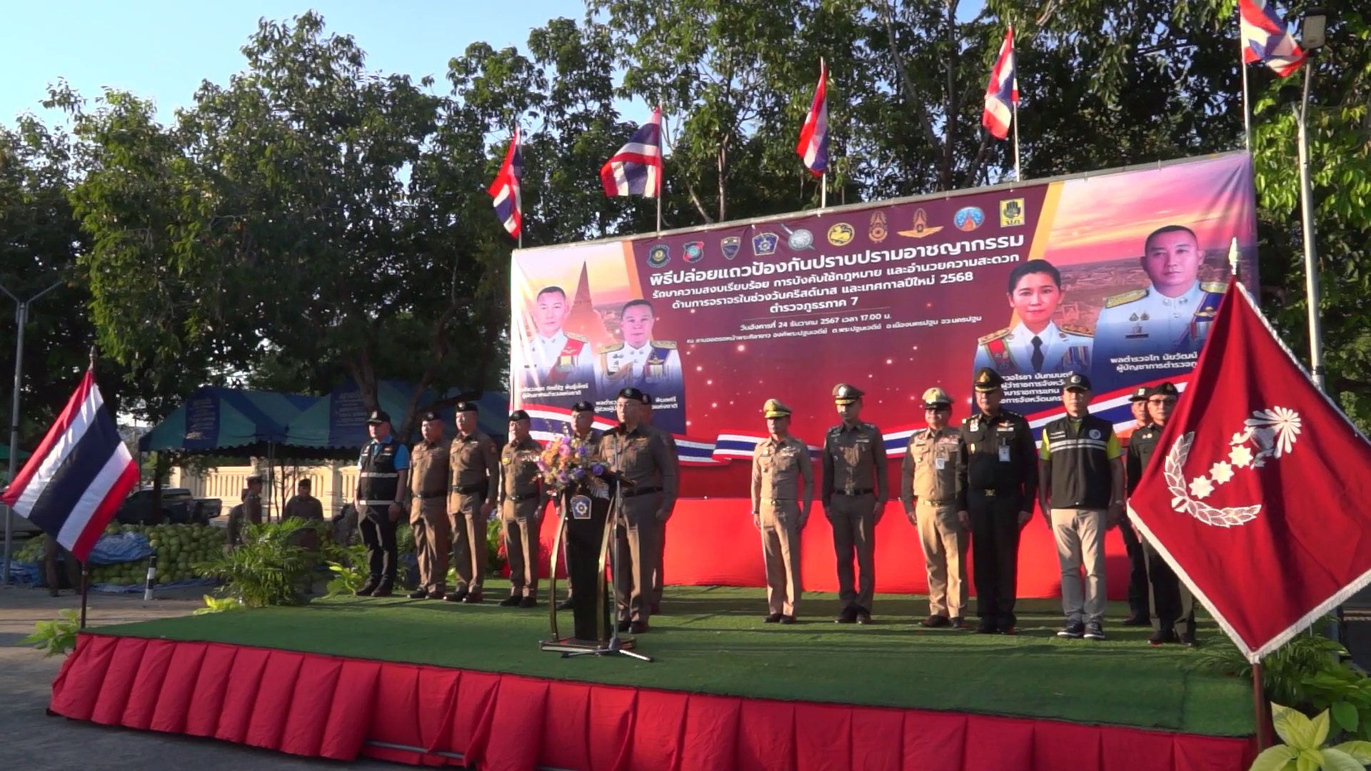 วันอังคารที่ 24 ธันวาคม 2567 เวลา 17.00 น. ณ บริเวณลานจอดรถหน้าพระศิลาขาว องค์พระปฐมเจดีย์ อำเภอเมืองนครปฐม จังหวัดนครปฐม พลตำรวจโท นัยวัฒน์ ผะเดิมชิต ผู้บัญชาการตำรวจภูธรภาค 7 เป็นประธานพิธีปล่อยแถวป้องกันปราบปรามอาชญากรรม รักษาความสงบเรียบร้อย การบังคับใช้กฎหมาย และอำนวยความสะดวกด้านการจราจรในช่วงเทศกาลวันคริสต์มาสและเทศกาลปีใหม่ 2568 โดยมี รองผู้บัญชาการตำรวจภูธรภาค 7 ข้าราชการทหาร ข้าราชการฝ่ายปกครอง หน่วยงานตำรวจที่เกี่ยวข้องในพื้นที่จังหวัดนครปฐม (ตำรวจทางหลวง ตำรวจท่องเที่ยว ตำรวจสันติบาล ตำรวจปราบปรามยาเสพติด ตำรวจพิสูจน์หลักฐาน) ข้าราชการตำรวจในสังกัดตำรวจภูธรจังหวัดนครปฐม ชุดปฏิบัติการพิเศษ (อินทรี 7) กองบังคับการสืบสวนสอบสวนตำรวจภูธรภาค 7 และอาสาสมัครตำรวจบ้าน เข้าร่วมพิธีฯ
