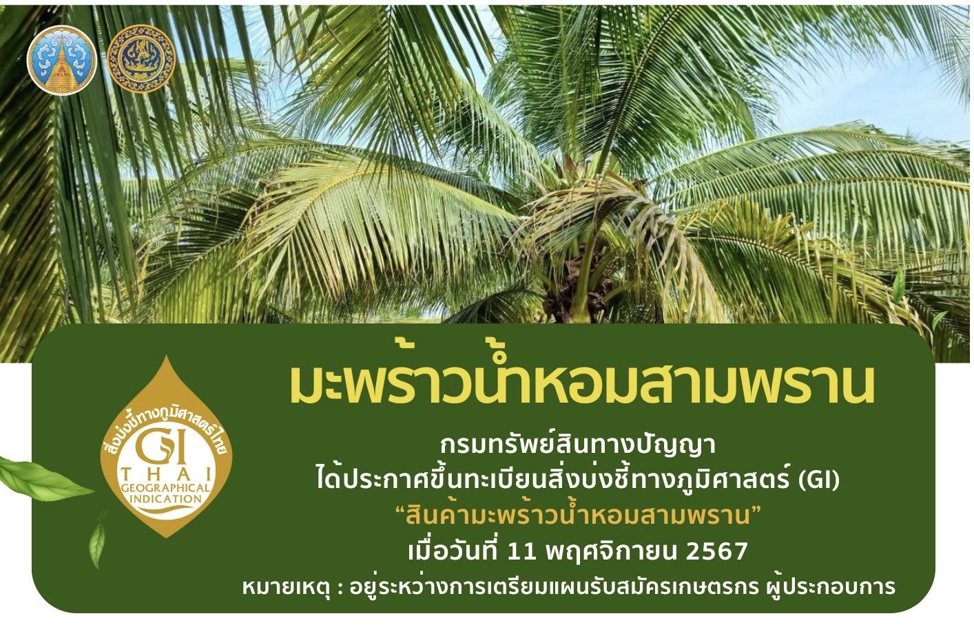 สำนักงานพาณิชย์จังหวัดนครปฐม เปิดเผยข้อมูลว่า กรมทรัพย์สินทางปัญญาได้ประกาศขึ้นทะเบียนสิ่งบ่งชี้ทางภูมิศาสตร์ (GI) รายการใหม่ คือ มะพร้าวน้ำหอมสามพราน ซึ่งเป็นสินค้า GI ลำดับที่ 2 ของจังหวัดนครปฐม (ต่อจากส้มโอนครชัยศรี) ซึ่งจะทำให้มะพร้าวน้ำหอมสามพรานเป็นที่รู้จักและได้รับความนิยมจากผู้บริโภคคนไทยและต่างชาติเพิ่มขึ้น รวมถึงจะช่วยสร้างรายได้ให้กับเกษตรกรในพื้นที่ได้มากขึ้นสำหรับมะพร้าวน้ำหอมสามพราน ปลูกในพื้นที่ราบลุ่มของแม่น้ำนครชัยศรี ที่มีดินตะกอนทับถมโดยมีแร่ธาตุต่าง ๆ มาสะสมไว้ ทำให้ดินในพื้นที่มีเนื้อเหนียวสีน้ำตาล ดินชั้นบนมีลักษณะทับถมเป็นชั้น ๆ ดินชั้นล่างเป็นสีน้ำตาล ปนเหลือง ด้วยแหล่งภูมิศาสตร์ส่งผลให้มะพร้าวน้ำหอม มีเปลือกสีเขียวปนเหลือง เนื้อสีขาว นุ่ม น้ำมะพร้าว มีรสชาติหวาน และกลิ่นหอมคล้ายใบเตยต่อมา ได้มีการนำมะพร้าวน้ำหอมไปปลูกในพื้นที่อำเภอสามพราน ถ่ายทอดความรู้ภูมิปัญญาของเกษตรกรจากรุ่นสู่รุ่น จนมีการขยายพันธุ์อย่างกว้างขวาง นับว่าเป็นอีกหนึ่งสินค้าที่ได้รับความนิยม อีกทั้งยังเป็นพืชเศรษฐกิจที่มีมูลค่าส่งออกและได้รับความนิยมจากผู้บริโภคคนไทยและต่างชาติ รวมถึงมีการออกร้านแสดงและจำหน่ายสินค้าตามงานต่าง ๆ จนโด่งดังและเป็นที่รู้จักกันอย่างแพร่หลายในปัจจุบัน สร้างชื่อเสียงและรายได้สู่เกษตรกรในพื้นที่จังหวัดนครปฐมกว่า 572 ล้านบาทต่อปี