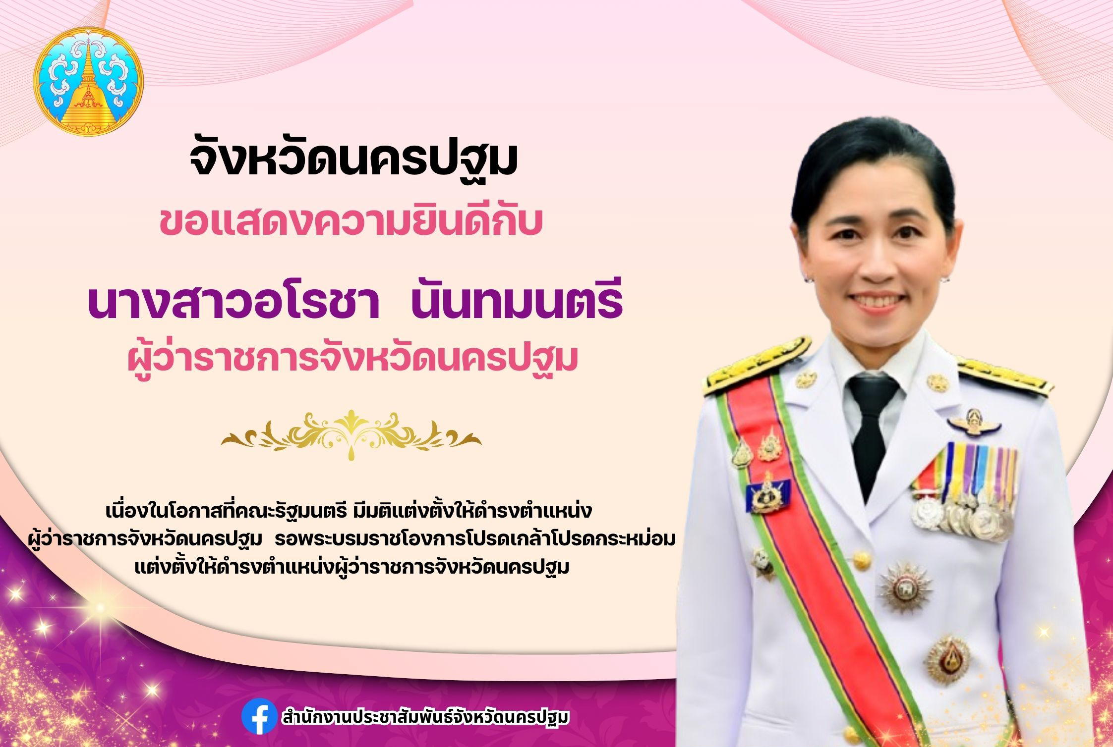 จังหวัดนครปฐม ขอแสดงความยินดีกับ นางสาวอโรชา นันทมนตรี ผู้ว่าราชการจังหวัดนครปฐม เนื่องในโอกาสที่คณะรัฐมนตรี มีมติแต่งตั้งให้ดำรงตำแหน่ง
