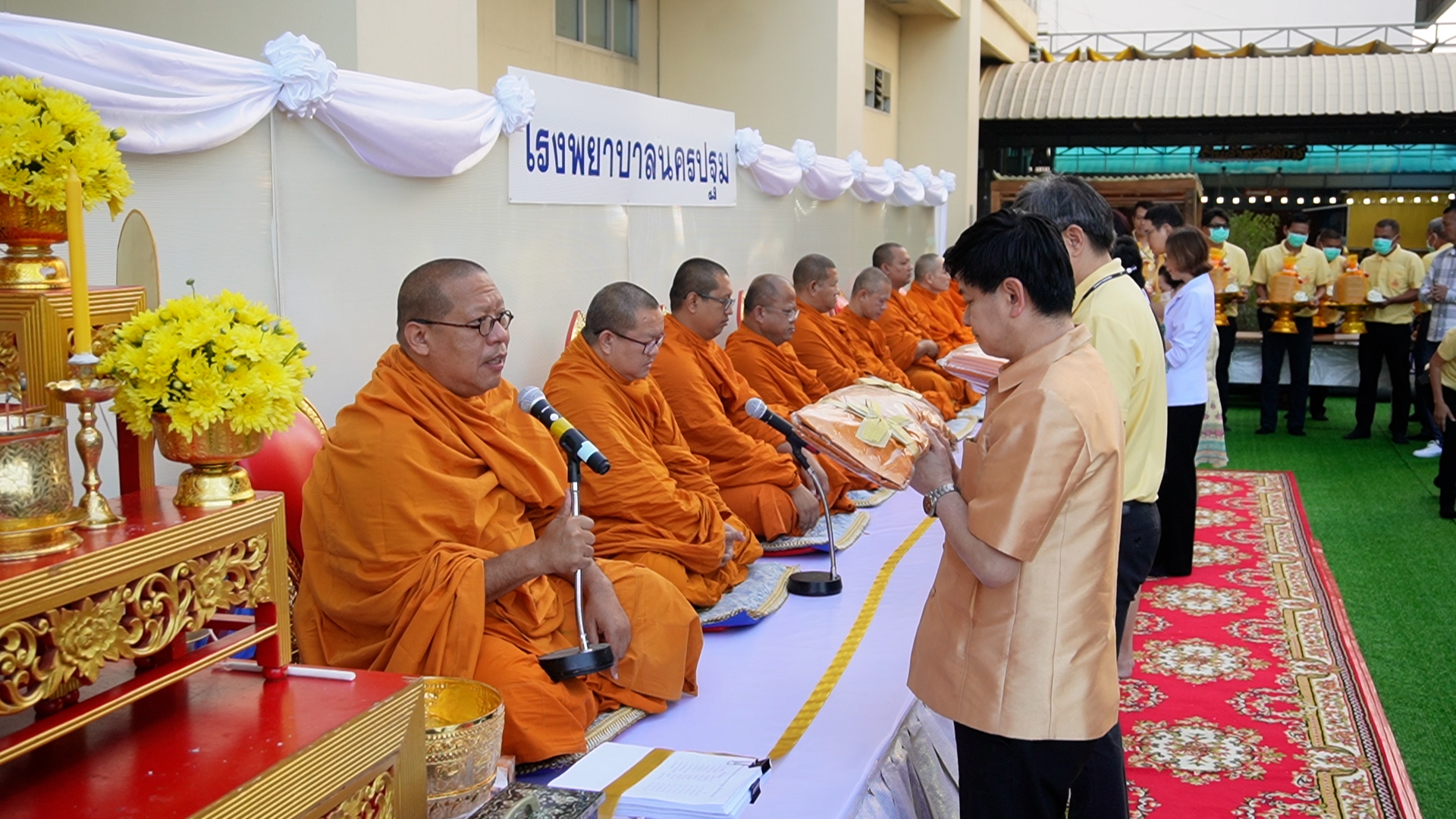 โดยช่วงเช้า นายแพทย์สุรชัย โชคครรชิตไชย ผู้อำนวยการโรงพยาบาลนครปฐม นำคณะผู้บริหารบูชาสิ่งศักดิ์สิทธิ์ และเริ่มพิธีอย่างเป็นทางการโดยการร้องเพลงชาติและเริ่มพิธีการทางศาสนา กราบบูชาพระรัตนตรัย ศาสนพิธีอาราธนาพระปริตร พระครูปลัดสิทธิวัฒน์ หลวงพี่น้ำฝน นำสวดเจริญพระพุทธมนต์ จากนั้นผู้อำนวยการโรงพยาบาลนครปฐม ทอดผ้าบังสุกุล อุทิศส่วนกุศลให้กับอดีตผู้อำนวยการโรงพยาบาลนครปฐม ผู้บริหาร เจ้าหน้าที่และบุคคลากรทางการแพทย์รวมถึงผู้ป่วยผู้ล่วงลับ และถวายจตุปัจจัยไทยธรรมแด่พระภิกษุสงฆ์ กราบบูชาพระรัตนตรัย