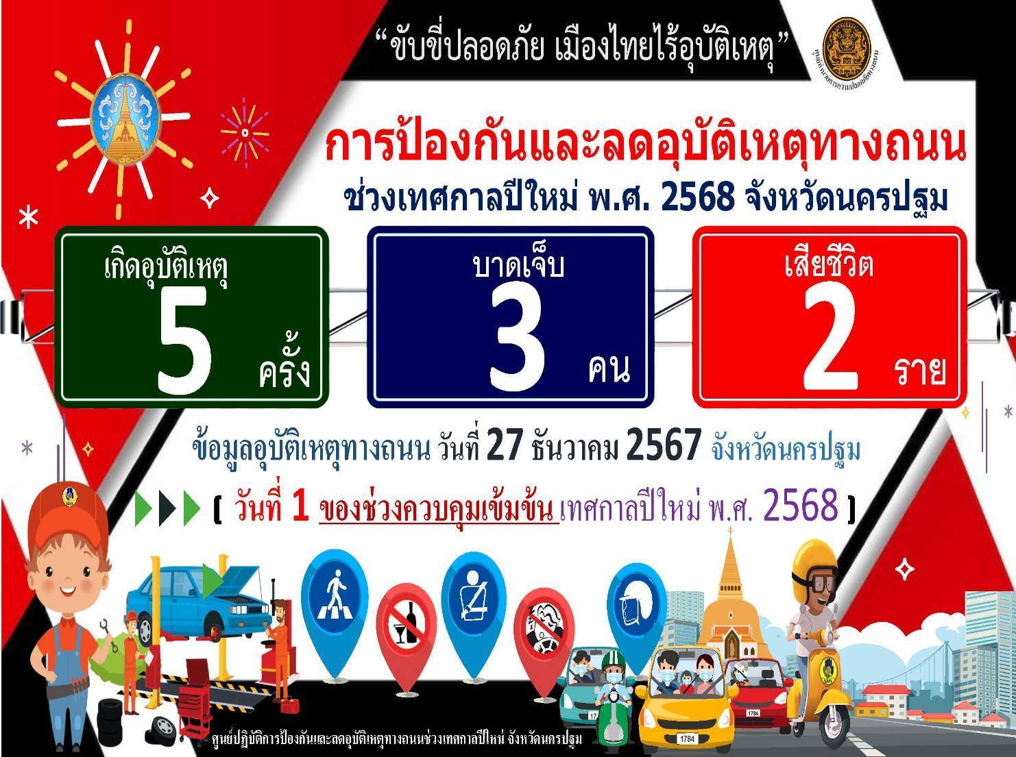 สำหรับจังหวัดนครปฐม ได้สรุปผลการเกิดอุบัติเหตุทางถนนวันที่ 1 ของช่วงควบคุมเข้มข้น ประจำวันที่ 27 ธันวาคม 2567 มีการเกิดอุบัติเหตุ จำนวน 5 ครั้ง บาดเจ็บ จำนวน 3 คน มีผู้เสียชีวิต 2 คน ได้แก่ พื้นที่อำเภอเมืองนครปฐม และอำเภอบางเลน