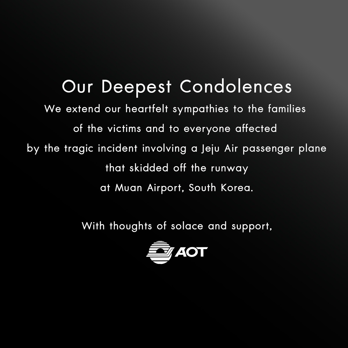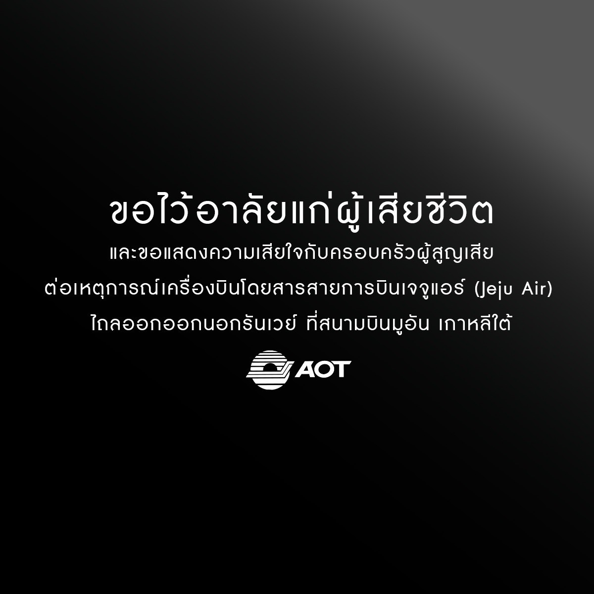 “สุริยะ” แสดงความเสียใจอย่างสุดซึ้ง เหตุเครื่องบิน “เจจูแอร์ไลน์” ไถลไปตามรันเวย์และเกิดไฟลุกไหม้ ที่ประเทศเกาหลีใต้ เป็นเหตุให้มีผู้เสียชีวิต-บาดเจ็บ เผย ก.คมนาคมพร้อมให้ความสนับสนุนช่วยเหลือเต็มที่ ด้าน ทอท. มั่นใจ! การบริหารจัดการของประเทศไทย เป็นไปตามมาตรฐานสากลในการ ตรวจสอบด้านความปลอดภัย(ทั้ง safety และ Security) ของเครื่องบินทุกลำก่อนออกเดินทาง ยืนยันให้ความสำคัญต่อความปลอดภัยแก่ผู้โดยสารเป็นอันดับแรก