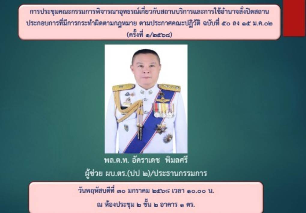 ประธานกรรมการ เป็นประธานประชุมคณะกรรมการพิจารณาอุทธรณ์เกี่ยวกับสถานบริการและการใช้อำนาจสั่งปิดสถานประกอบการที่กระทำผิดกฎหมาย ตามประกาศคณะปฏิวัติ ฉบับที่ 50 ลงวันที่ 15 มี.ค. 2502 ครั้งที่ 1/2568