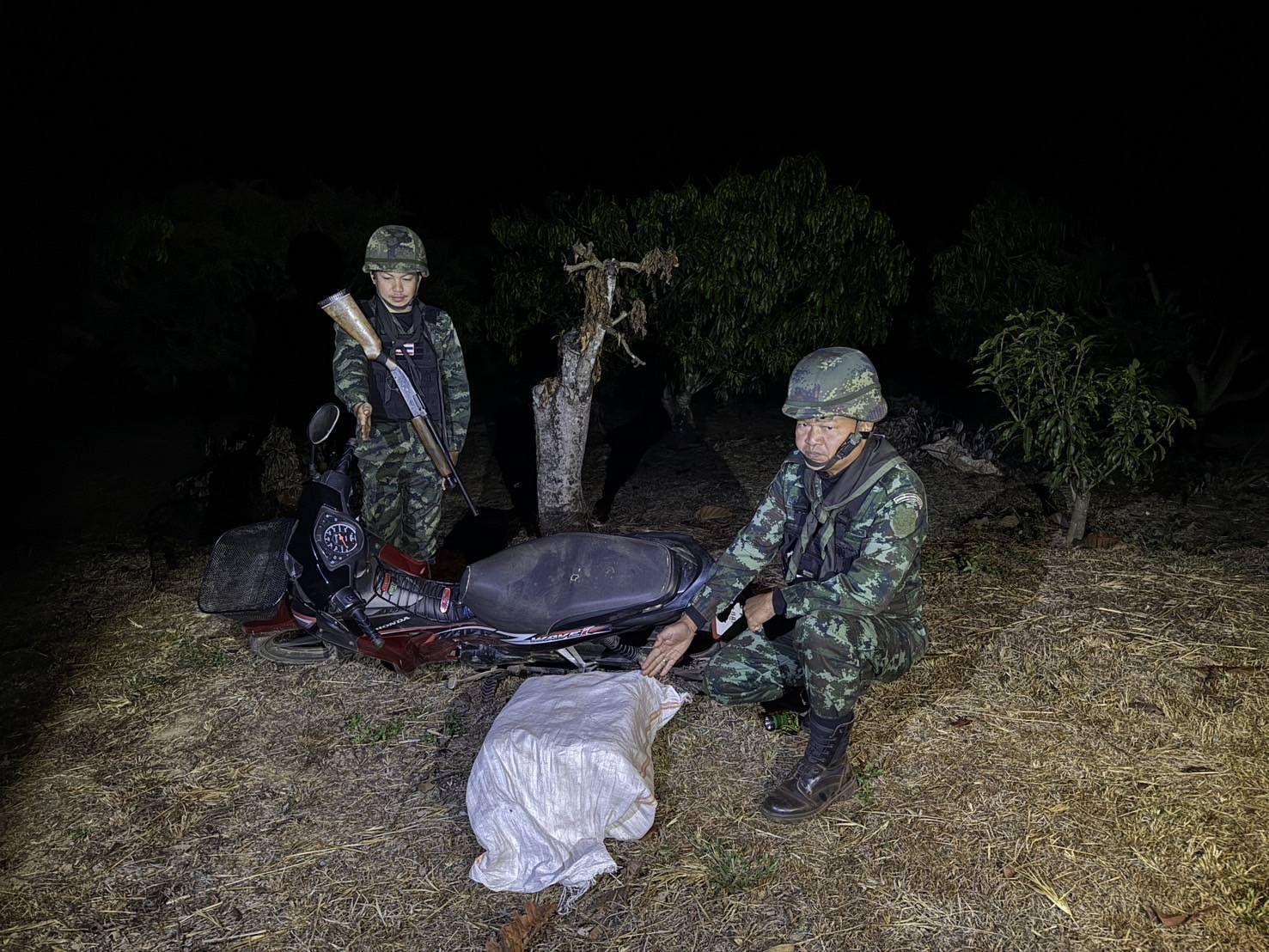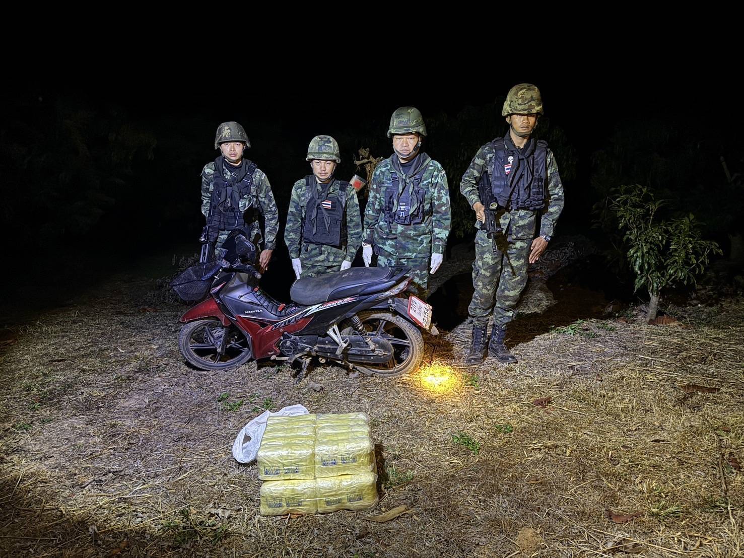 ชุดปฏิบัติการจึงแสดงตัวขอตรวจค้น แต่บุคคลต้องสงสัยดังกล่าว เมื่อเห็น เจ้าหน้าที่ทหาร จึงทิ้งรถจักรยานยนต์ โดย อาศัยทัศนวิสัยจำกัดและความชำนาญในภูมิประเทศสามารถหลบหนีไปได้ หน่วยได้วางกำลังเข้าควบคุมพื้นที่ และตรวจสอบพื้นที่ ตรวจพบกระสอบปุ๋ยสีขาว จำนวน 1 กระสอบ วางอยู่บริเวณระหว่างหน้าเบาะรถจักรยานยนต์ภายในบรรจุยาเสพติดให้โทษประเภท 1 (ยาบ้า) จำนวนประมาณ 200,000 เม็ด และรถจักรยานยนต์ จำนวน 1 คัน และตรวจค้นใต้เบาะรถจักรยานยนต์ พบเอกสารคู่มือทะเบียนรถ โดยผู้ถือกรรมสิทธิ์ชื่อ นายซิ่นหมิง แซ่โก๋ อายุ 59 ปี สัญชาติจีน ที่อยู่ 337/ช หมู่ 10 บ้านอรุโณทัย ตำบลเมืองนะ อำเภอเชียงดาว จังหวัดเชีงใหม่