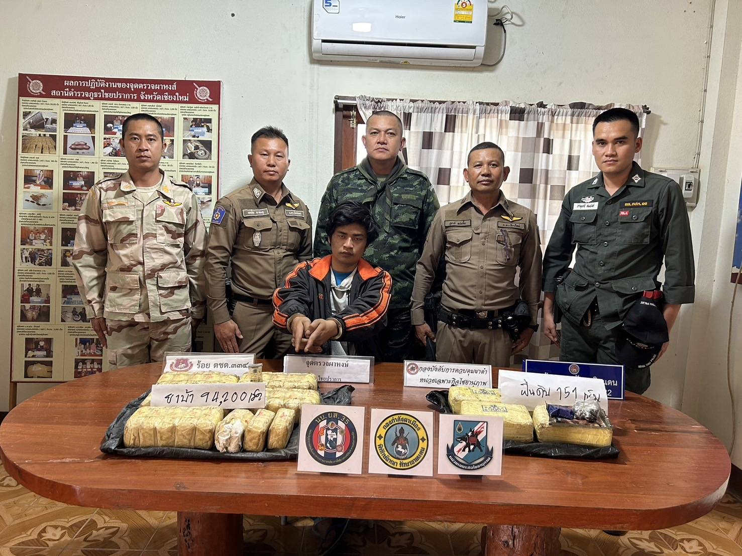 บูรณาการร่วมปราบปรามยาเสพติดตามนโยบายรัฐบาลไทย ทางตำรวจภูธรด่านผาหงส์ สายตรวจ สถานีตำรวจภูธรไชยปราการ จังหวัดเชียงใหม่ ร่วม ทหารม้าหน่วยเฉพาะกิจไชยานุภาพ กองกำลังผาเมือง ฝ่ายปกครองอำเภอไชยปราการ อาสาสมัครรักษาชายแดนไชยปราการ ตำรวจตระเวนชายแดน 334 ตำรวจหน่วยปราบปราบยาเสพติดฝาง นบยส35 ฯ ได้ร่วมจัดการบูรณาการ ร่วมจัดการยาเสพติด ได้ออกลาดตระเวนตามช่องทางที่คาดว่าจะมีการลักลอบนำยาเสพติดชายแดนไทยพม่าเข้าพื้นที่ชั้นใน วันนี้เวลา 08.05 น ได้พบคนขับรถจักรยานยนต์ สีดำ3กง2566 เชียงใหม่ มาตามช่องทาง เจ้าหน้าที่จึงได้ร่วมตรวจค้น พบว่าในรถมีการซุกซ่อนยาเสพติด ยาบ้า 94,000 เม็ด และฝิ่นดิบ200กรัม จึงได้ควบคุมตัวนาย บ้า ผู้ต้องหา มาทำการสอบสวนเพิ่มเติมเพื่อจะขยายผลที่มา และที่ไปของยาเสพติดนี้ต่อไป แล้วนำผู้ต้องหาและยาบ้าส่งเจ้าพนักงานสอบสวนเพื่อดำเนินการตามกฏหมายต่อไป
