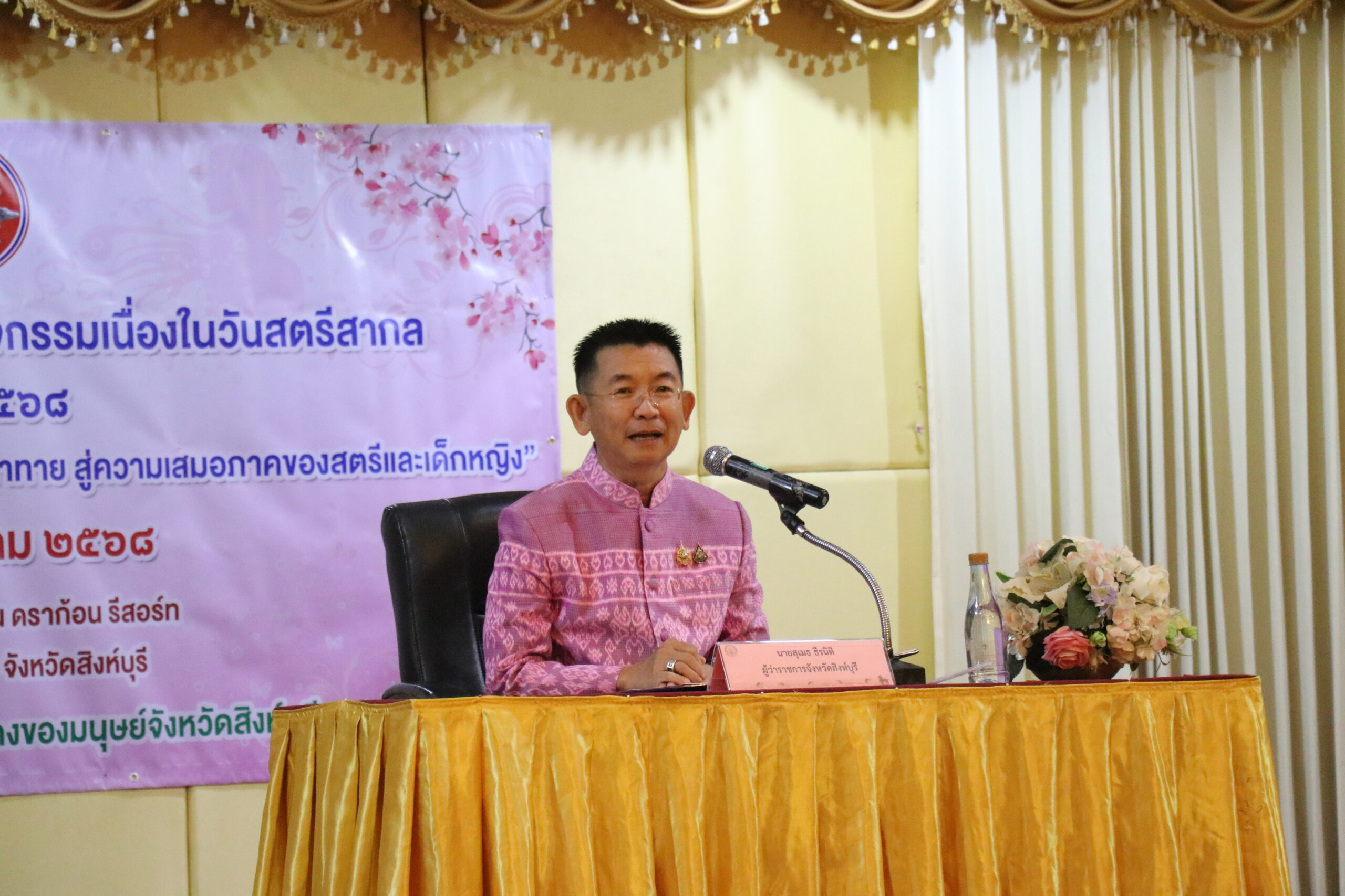 วันที่ 11 มีนาคม 2568 เวลา 9.00 น.นายสุเมธ ธีรนิติ ผู้ว่าราชการจังหวัดสิงห์บุรีเป็นประธานพิธีโครงการสมัชชาสตรีระดับจังหวัด เนื่องในวันสตรีสากล ปี 2568ภายใจ้แนวคิด 3 ทศวรรษปฏิฏาณปักกิ่น โอกาสและความท้าทายสู่ความเสมอภาคของสตรีและเด็กหญิง ณ ห้องราชาวดี ชั้น 5 โรงแรมโกลเด้น ดราก้อน รีสอร์ท จังหวัดสิงห์บุรี โดยมี นางวาสนา ธีรนิติ นายกเเหล่ากาชาดจังหวัดสิงห์บุรี รองผู้ว่าราชการจังหวัดสิงห์บุรี นางสาวมนชยา ปรีชา พัฒนาสังคมและความมั่นคงของมนุษย์จังหวัดสิงห์บุรี หัวหน้าส่วนราชการเครือข่ายพัฒนาสตรีเทศบาลเมืองสิงห์บุรี เครื่อข่ายสตรีจังหวัดสิงห์บุรี อาสาสมัครพัฒนาสังคมและความมั่นคงของมนุษย์ จำนวน 60 คน