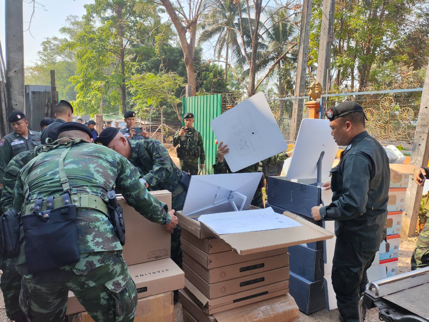 กาญจนบุรี ทหารหน่วยเฉพาะกิจลาดหญ้า ตำรวจภูธรสังขละบุรี ยึดเครื่องรับสัญญาณดาวเทียม (starlink) 21 เครื่องขณะกำลังจะลำเลียงผ่านข้ามไปเมืองพยาตองซู ประเทศเมียนมา คิดนำไปใช้ในขบวนการแก็งคอลเซ็นเตอร์ในเมืองพยาตองซู