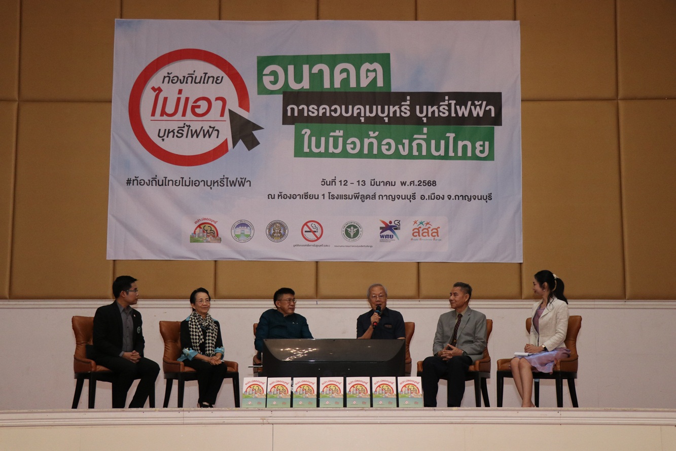 วันที่12 มีนาคม 2568 ที่ห้องอาเซียน 2 โรงแรมพีลูดส์ กาญจนบุรี นายอธิสรรค์ อินทร์ตรา ผู้ว่าราชการจังหวัดกาญจนบุรี มอบหมายให้ ว่าที่ร้อยตรี ศุภมงคล บูชาถ่ายเทศ รองผู้ว่าราชการจังหวัดกาญจนบุรี เป็นประธานเปิดเวที “อนาคตการควบคุมบุหรี่ บุหรี่ไฟฟ้า ในมือท้องถิ่นไทย” ณ จังหวัดกาญจนบุรี โดยมี ศาสตราจารย์เกียรติคุณ นายแพทย์ ประกิต วาทีสาธกกิจ ประธานมูลนิธิรณรงค์เพื่อการไม่สูบบุหรี่ ผศ.ดร.ลักขณา เติมศิริกุลชัย ผู้อำนวยการศูนย์พัฒนาศักยภาพกำลังคนด้านการควบคุมยาสูบ (พศย.) นายจิระวัฒน์ อยู่สะบาย รองผู้อำนวยการกองงานคณะกรรมการควบคุมผลิตภัณฑ์ยาสูบ กรมควบคุมโรค กระทรวงสาธารณสุข ดร.ศีรสุข แสนยอดคำ รองเลขาธิการสมาคมสันนิบาตเทศบาลแห่งประเทศไทย ดร.ปราโมทย์ อุ่นจิตสกุล นายกเทศมนตรีเมืองปากแพรก พร้อมด้วย หน่วยงานที่เกี่ยวข้อง ภาคีเครือข่าย เข้าร่วมพิธีเปิด เวทีสนทนาฯ