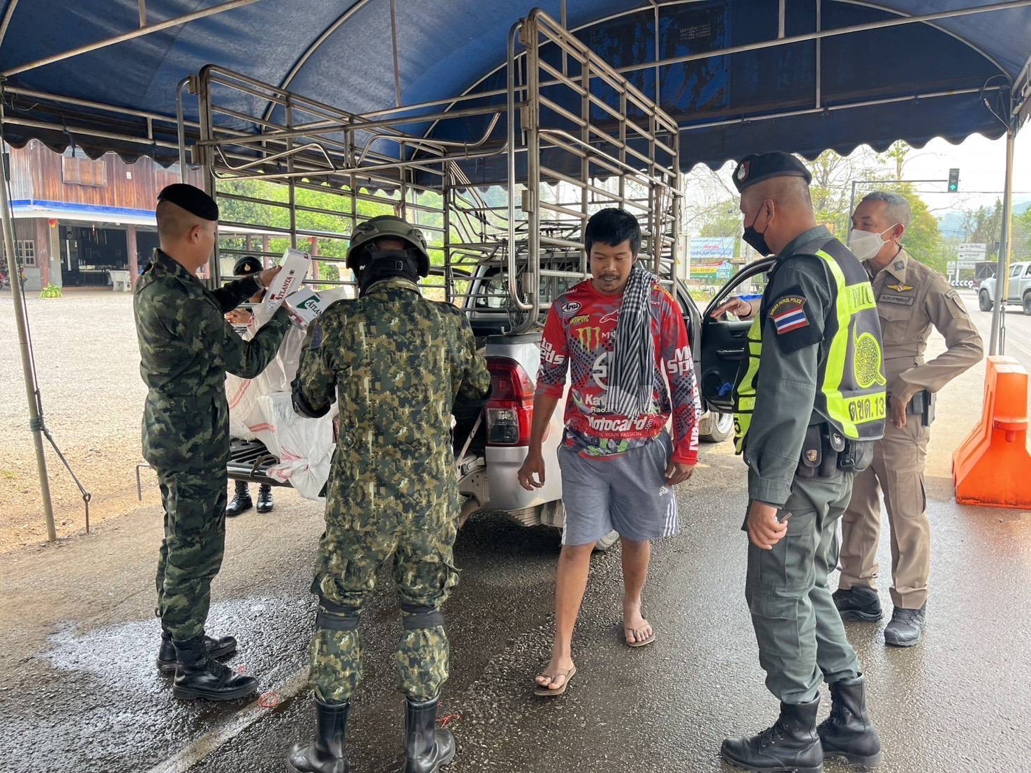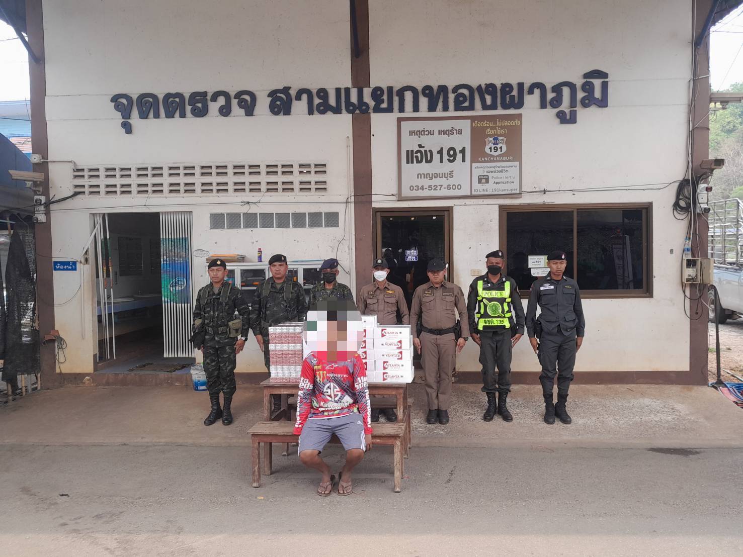 โดยได้ร่วมกันตั้งจุดตรวจร่วมสามแยกทองผาภูมิ ตามเส้นทางที่คาดว่าจะมีการขนสินค้าเลี่ยงภาษีผ่านมา กระทั่งพบ นาย ซอ ยี ไม่มีชื่อสกุล อายุ 34 ปี เป็นผู้ขับรถขนส่งสินค้าส่งออก หมายเลขทะเบียน ผข 8483 ราชบุรี เจ้าหน้าที่ทหารจึงให้สัญญาณขอตรวจค้น พบบุหรี่เลี่ยงภาษี จำนวน 2,000 ซอง รวมมูลค่ากว่า 22,000 บาท โดยบรรจุอยู่ภายในกระสอบ บรรทุกอยู่ด้านท้ายรถยนต์คันดังกล่าว พร้อมทั้งใช้แผ่นผ้าขนาดใหญ่ปิดคลุมทับเอาไว้อีกชั้น เพื่อซ่อนเร้นการตรวจสอบจากเจ้าหน้าที่