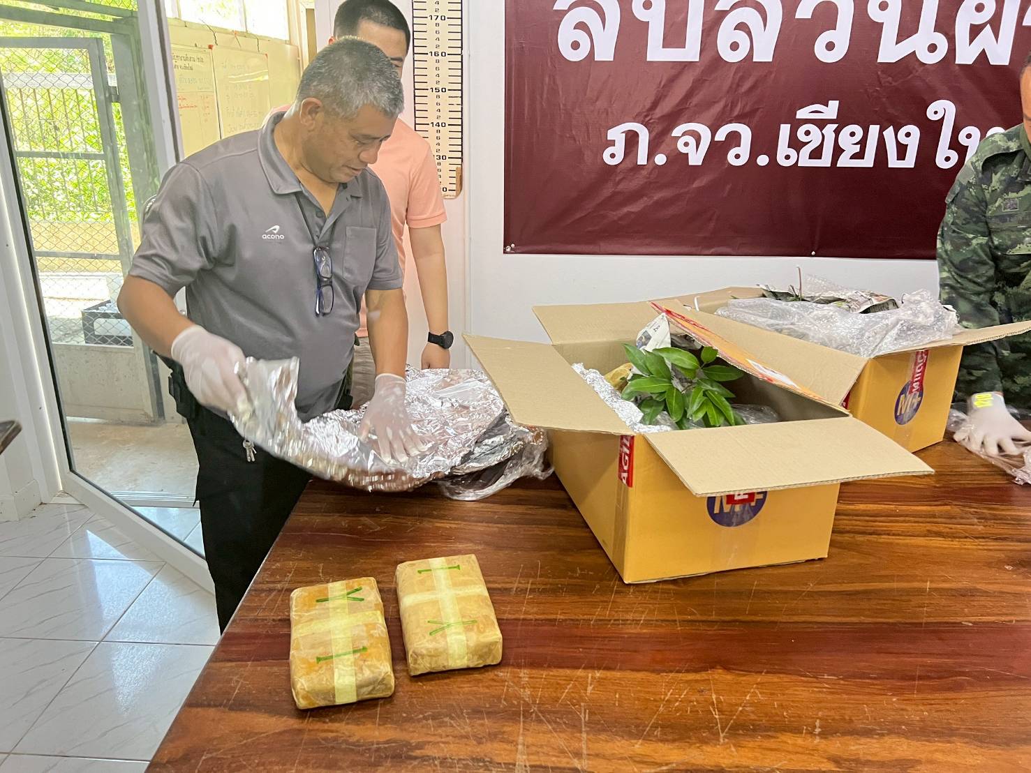 ทางกองบังคับการควบคุมผาดำ หน่วยเฉพาะกิจไชยานุภาพรับแจ้งจากพนักงานรับพัสดุของบริษัทขนส่ง Flash Home ว่าพบกล่องพัสดุต้องสงสัยซึ่งคาดว่าจะเป็นกล่องบรรจุสิ่งผิดกฎหมาย โดยเมื่อ 6 พ.ค. 68 มีรถยนต์กระบะยี่ห้อ โตโยต้า วีโก้ สีน้ำเงิน ไม่ทราบหมายเลขทะเบียน มาจอดหน้าร้าน และมีชาย 1 ราย สวมเสื้อแขนยาวสีน้ำเงิน กางเกงขาสั้น สะพายกระเป๋า และสวมหมวก นำกล่องพัสดุ จำนวน 2 กล่อง มาติดต่อในการส่งพัสดุ โดยแจ้งว่าเป็นกล่องบรรจุผลไม้ (ลิ้นจี่) แต่เมื่อ น.ส.ออย นำกล่องขึ้นชั่งน้ำหนัก พบว่ากล่องมีน้ำหนักมากกว่ากล่องบรรจุผลไม้ปกติ หน่วยจึงประสานกับฝ่ายสืบสวน สภ.ฝาง , อส.อ.ฝาง และ นบ.ยส.35 เข้าทำการตรวจสอบกล่องพัสดุต้องสงสัย จำนวน 2 กล่อง ที่อยู่ในบริษัทขนส่ง Flash Home เลขที่ 177 บ.หนองยาว ม.7 ตำบลแม่สูน อำเภอฝาง จังหวัดเชียงใหม่ โดยหน้ากล่องระบุผู้ส่งคือ นายสมหมาย คำนะ บ้านเลขที่ 12/1 บ.คายใน ม.2 ต.แม่นาวาง อำเภอแม่อาย จังหวัดเชียงใหม่ และระบุชื่อผู้รับคือ นายไชยวัฒน์ ริมสกุล บ้านเลขที่ 55 บ.โนนม่วง ม.7 ต.ชุมภูพร อ.ศรีวิไล จังหวัดบึงกาฬ จากการตรวจสอบภายในกล่องทั้ง 2 กล่อง