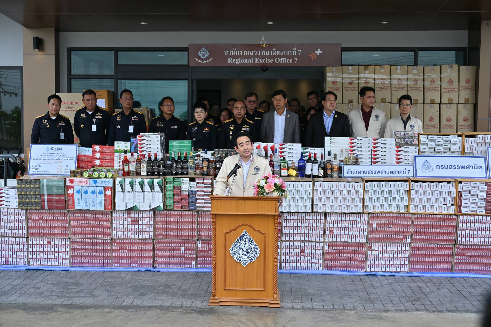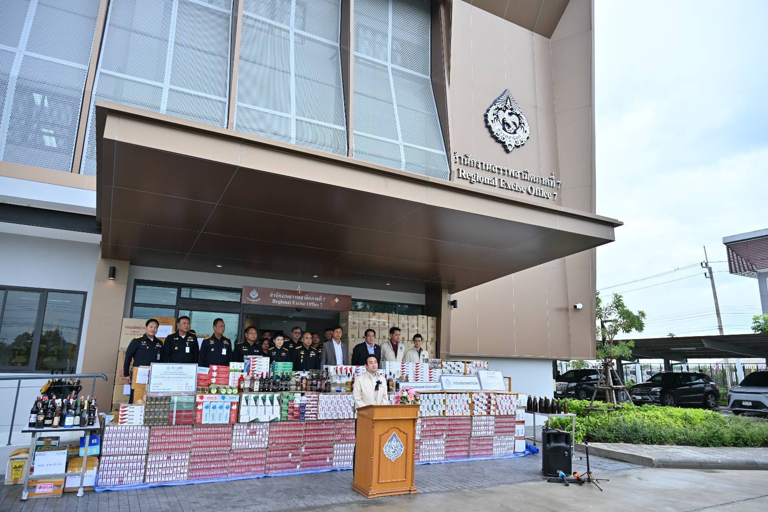 ดร. เผ่าภูมิ โรจนสกุล รัฐมนตรีช่วยว่าการกระทรวงการคลัง เปิดเผยว่า การลงพื้นที่ในครั้งนี้ มีเป้าหมายเพื่อขับเคลื่อนแนวทางการปฏิบัติงานให้เกิดผลอย่างเป็นรูปธรรม โดยเฉพาะการเร่งรัดปราบปรามบุหรี่เถื่อน ซึ่งนับเป็นหนึ่งในสินค้าที่มีการหลีกเลี่ยงภาษีสรรพสามิตอย่างแพร่หลาย ผ่านการลักลอบนำเข้ามาตามแนวชายแดนและนำมาจำหน่ายในพื้นที่ต่างๆ รวมถึงการจำหน่ายผ่านช่องทางออนไลน์ โดยเมื่อวันที่ 4 พฤษภาคมที่ผ่านมา สำนักงานสรรพสามิตภาคที่ 7 ได้รับรายงานว่ามีขบวนการลักลอบนำเข้าบุหรี่จากพื้นที่ชายแดน ผ่านอำเภอสังขละบุรี ผ่านช่องทางธรรมชาติในลักษณะที่เรียกว่ากองทัพมด ซึ่งเป็นการลำเลียงนำสินค้าเข้ามาในปริมาณน้อยแต่ทำอย่างต่อเนื่อง เพื่อหลบเลี่ยงการตรวจสอบของเจ้าหน้าที่จากการสืบสวนและเข้าตรวจค้น เจ้าหน้าที่สามารถตรวจยึดของกลางบุหรี่ที่มิชอบด้วยกฎหมายได้ จำนวนทั้งสิ้น 35,250 ซอง แบ่งเป็นบุหรี่ตรากรองทิพย์ 90 (FOR EXPORT ONLY) ซองอ่อน จำนวน 30,000 ซอง, บุหรี่ตรากรองทิพย์ 90 (FOR EXPORT ONLY) ซองแข็ง จำนวน 5,150 ซอง และบุหรี่ต่างประเทศตรา D&J จำนวน 100 ซอง คิดเป็นมูลค่าความเสียหายทางภาษีและละค่าปรับรวม 4,707,894.48 บาท