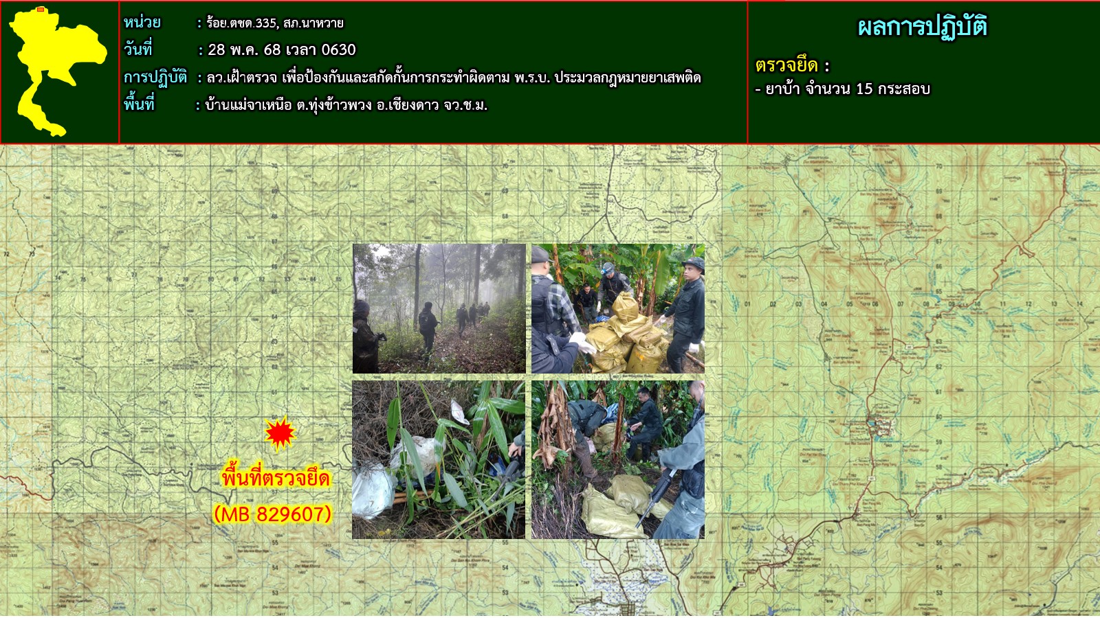ซึ่ง อยู่ในพื้นที่สูง เดินเท้าลงมาเชิงเขา ชุดปฏิบัติการจึงแสดงตัวขอตรวจค้น แต่กลุ่มขบวนการฯ ใช้ความชำนาญในพื้นที่ และ ทัศนวิสัยจำกัด หลบหนีไปได้ หน่วยจึงวางกำลังควบคุมพื้นที่ จนถึง วันที่ 28 พ.ค.68 เวลา 0630 จึงจัดกำลังเข้าตรวจสอบพื้นที่เกิดเหตุ ตรวจพบ ของกลาง กระสอบดัดแปลงเป็นเป้สะพายหลัง จำนวน 15 กระสอบ จึงตรวจยึด ของกลางกระสอบละ 200,000 เม็ด จำนวน 8 กระสอบ รวม 1,600,00 เม็ด และกระสอบละ 100,000 เม็ด จำนวน 7 กระสอบ รวม 700,000 เม็ด รวม 2,300,000 เม็ด จะมีการแถลงข่าวต่อไปจากนั้นจะได้นำยาเสพติดที่ยึดได้ส่งเจ้าพนักงานสอบสวนสถานีตำรวจภูธรเชียงดาว จังหวัดเชียงใหม่เพื่อทำการดำเนินคดีตามกฏหมายต่อไป