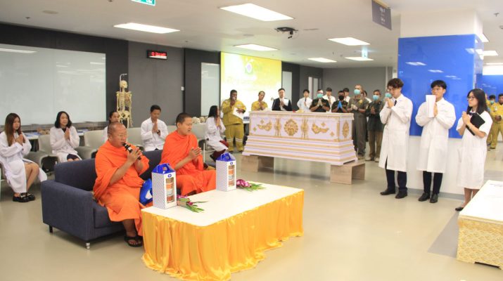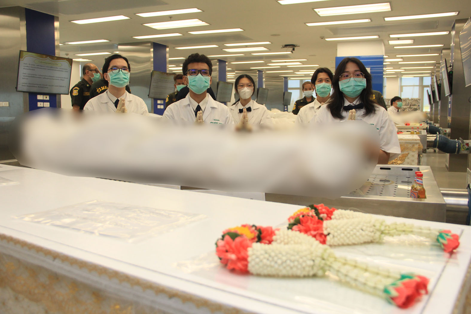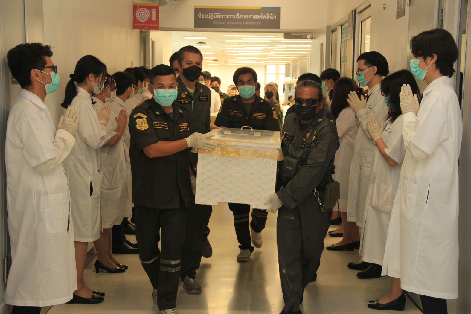 โดย นักศึกษาแพทย์ ชั้นปีที่ 2 พร้อม เจ้าหน้าที่มูลนิธิร่วมกตัญญู ได้ร่วมกันบรรจุร่าง “อาจารย์ใหญ่” จำนวน 67 ร่าง ก่อนเคลื่อนขบวนอย่างสมเกียรติไปยังวัดต่างๆ ในจังหวัดสมุทรปราการ ได้แก่ วัดบางพลีใหญ่กลาง 32 ร่าง / วัดลาดหวาย 15 ร่าง / วัดราษฎร์บูรณะ 10 ร่าง / วัดมงคลโคธาวาส 9 ร่าง และ วัดบางพลีใหญ่ใน พระอารามหลวง 1 ร่าง ซึ่งจะมี การสวดพระอภิธรรมศพ ใน วันที่ 7 มิถุนายน 2568 เวลา 16.00 น. และมี พิธีพระราชทานเพลิงศพเป็นกรณีพิเศษ ในวันที่ 8 มิถุนายน 2568 โดยจะมีการนำร่างประกอบพิธีแยกเป็นรายบุคคล เพื่อแยกเก็บอัฐิส่งมอบคืนแก่ครอบครัวของผู้บริจาคร่างกาย