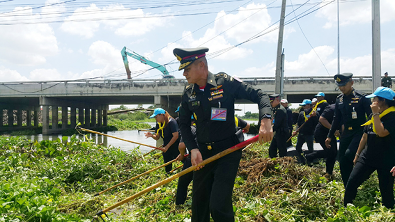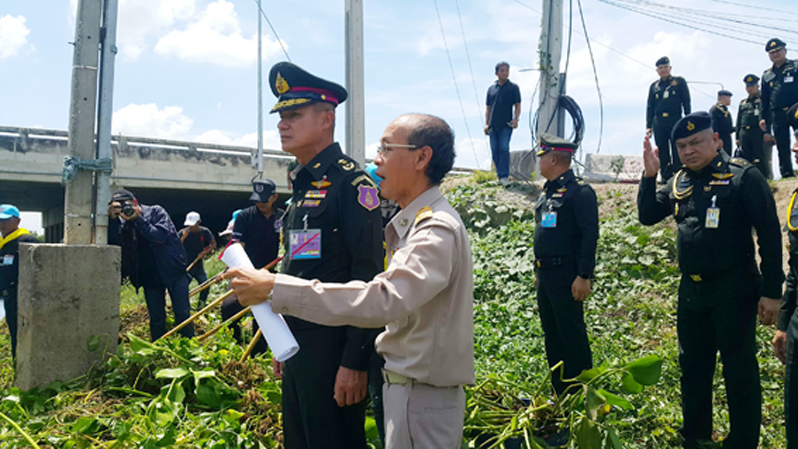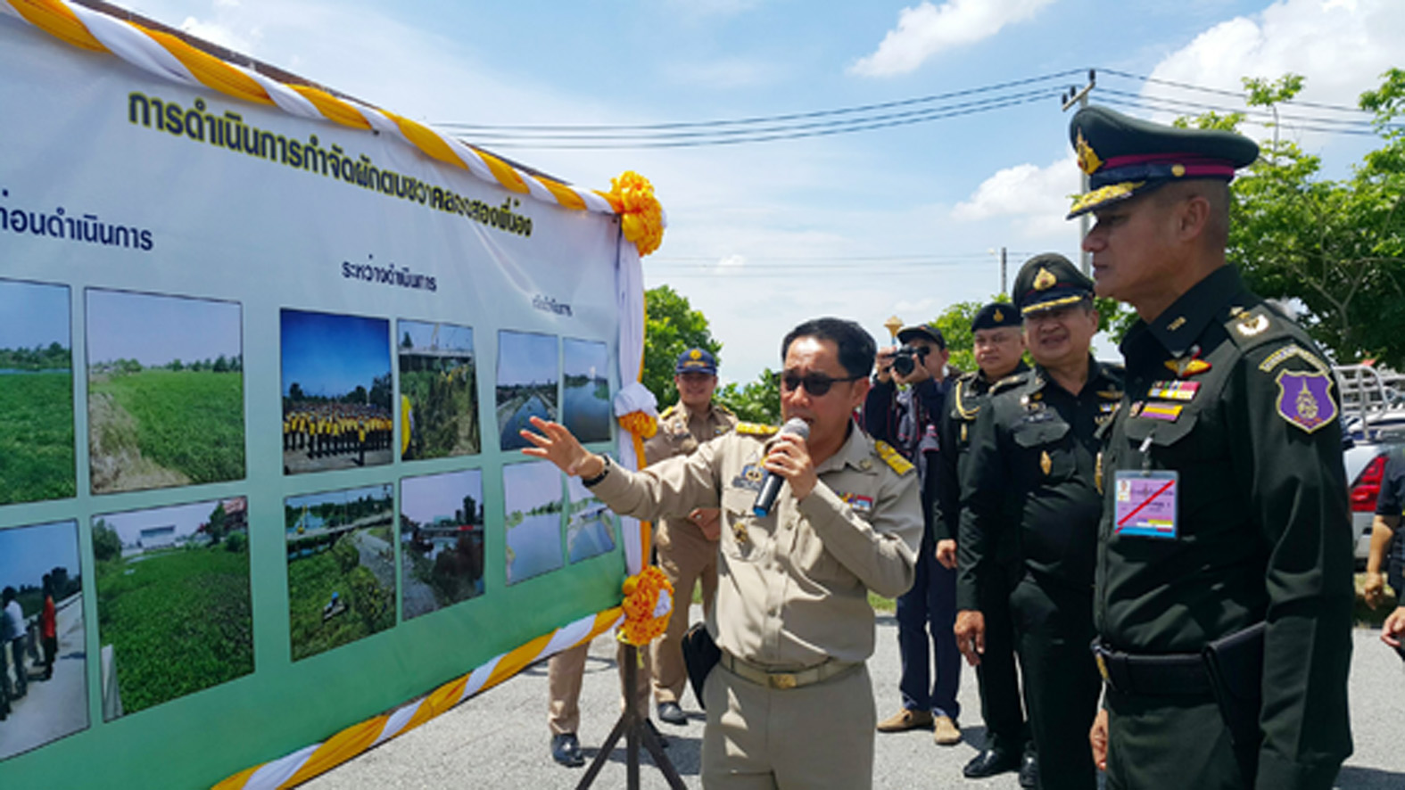 จากนั้นคณะของพลโท ธรรมนูญ วิถี และคณะผู้ติดตาม พร้อมนายนิมิต วันไชยธนวงศ์ ผู้ว่าราชการจังหวัดสุพรรณบุรี รองผู้ว่าราชการจังหวัด ปลัดจังหวัด หัวหน้าส่วนราชการที่เกี่ยวข้อง ได้เดินทางไปตรวจเยี่ยมผลการดำเนินโครงการกำจัดผักตบชวา พัฒนาคลองสองพี่น้อง ณ ประตูระบายน้ำบางสาม ตำบลบบางตะเคียน อำเภอสองพี่น้อง โดยมีนายนพฤทธิ์ ศิริโกศล ปลัดจังหวัดสุพรรณบุรี เป็นผู้บรรยายสรุป โครงการกำจัดผักตบชวา พัฒนาคลองสองพี่น้อง และเดินทางไปตรวจเยี่ยมกิจกรรมรวมพลังอาสาพัฒนาและป้องกันตนเอง หรือ อพป. ณ ที่ทำการองค์การบริหารส่วนตำบลบ่อสุพรรณ อำเภอสองพี่น้อง จังหวัดสุพรรณบุรี
