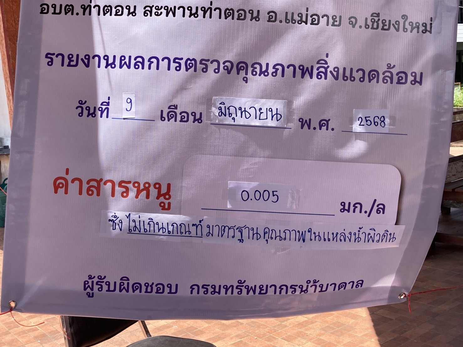 น.ส.ปภาวรินทร์ พ้นภัย นักวิทยาศาสตร์ กองมารตฐานคุณภาพน้ำบาดาล กรมทรัพยากรน้ำบาดาล กระทรวงทรัพยากรธรรมชาติและสิ่งแวดล้อม รับตรวจจุดที่1ศูนย์การแพทย์ไทย อบต. ท่าตอน อำเภอแม่อาย จังหวัดเชียงใหม่ ศูนย์เฝ้าระวังคุณภาพสิ่งแวดล้อมในพื้นที่(จุดที่1 น้ำกก)กระทรวงทรัพยากรธรรมชาติและสิ่งแวดล้อม ซึ่งมาทำการตรวจคุณภาพและสิ่งแวดล้อม โดยจะรับกรวดน้ำจากพื้นที่ตำบลท่าตอน ในเวลาประมาณ 1 เดือน เพื่อให้ประชาชนได้มั่นใจว่าสารพิษในน้ำแต่ละวันมีสารหนูประมาณเท่าไร เป็นอันตรายหรือว่าปลอดภัย ซึ่งในวันนี้ได้ตรวจลำน้ำ กก ที่บ้านท่าตอน ตรงจุดท่าจอดเรือหางยาวของตำบลท่าตอน ตรวจค่าสารหนูได้ในปริมาณ 0.0005 มิลลิกรัมต่อลิตร ซึ่งค่าไม่เกินเกณฑ์มาตรฐานคุณภาพในแหล่งน้ำผิวดิน น.ส.ปภาวรินทร์ พ้นภัย นักวิทยาศาสตร์ กองมารตฐานคุณภาพน้ำบาดาล แจ้งว่าประชาชนสามารถนำน้ำในพื้นที่ที่คิดว่าจะมีสารพิษให้นำมาตรวจได้ทุกวัน จะอยู่ประจำจุดนี้ประมาณ 1 เดือน ตรวจฟรีไม่เสียเงิน ซึ่งได้ทำการตรวจมาตั้งแต่วันที่ 6 มิถุนายน 2568 และจะประจำจุดตรวจนี้อีก 1เดือน