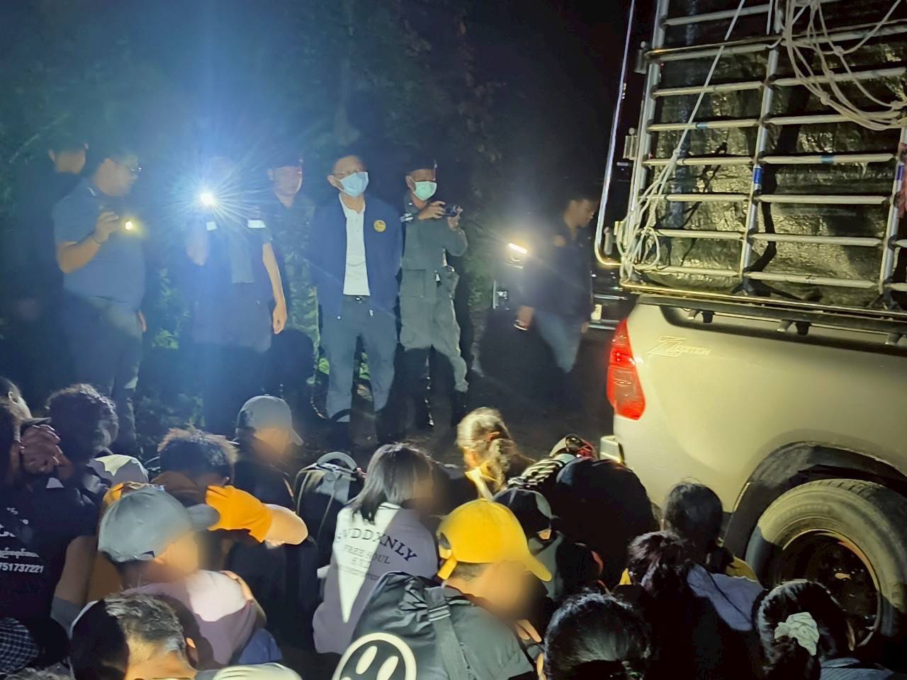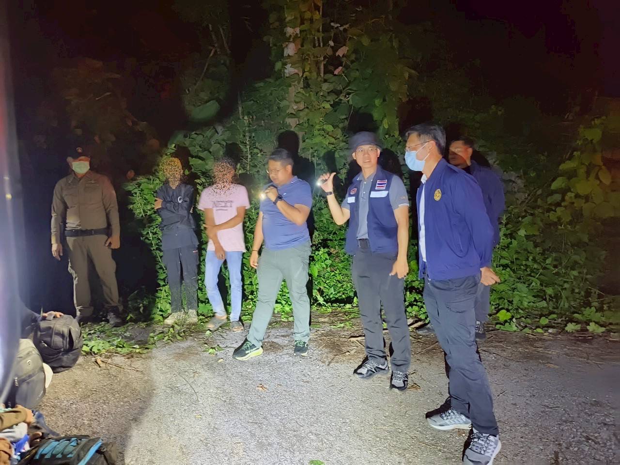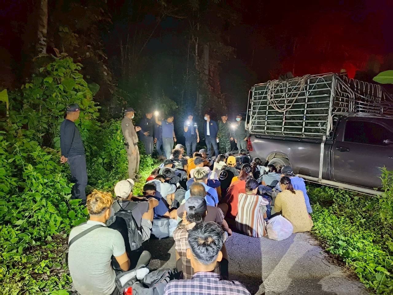 กาญจนบุรี อภ.ทองผาภูมิ นำทีม ไล่ล่ากระบะตีนผีซุกแรงงานเถื่อน คนขับเห็นจวนตัวทิ้งรถหลบหนีกลางดึก ปล่อย 44 แรงงานโดนจับ สารภาพใช้ไทยเป็นทางผ่านมุ่งหน้ามาเลเซีย จ่าย 76,000 บาทต่อหัว