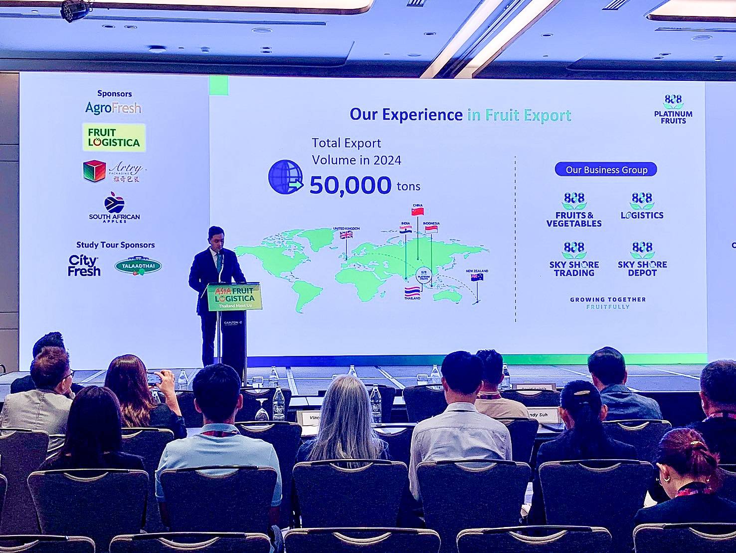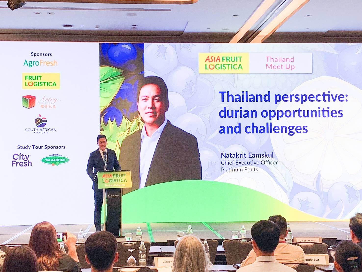 นายณธกฤษ เอี่ยมสกุล ประธานเจ้าหน้าที่บริหาร บริษัท แพลททินัม ฟรุ๊ต จำกัด (มหาชน) หรือ PTF ผู้ส่งออกผักและผลไม้สดเกรดพรีเมียม เปิดเผยถึงภาพรวมการส่งออกทุเรียนไทย ในงาน Asia Fruit Logistica Bangkok Meet Up
