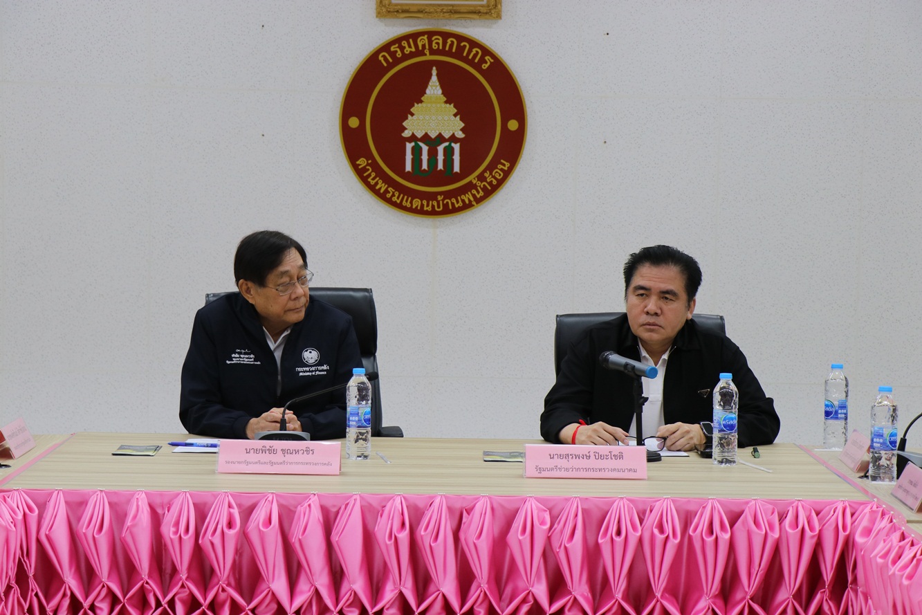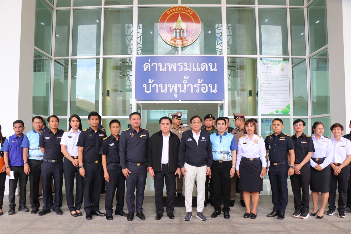 เมื่อวันที่ 28 มิถุนายน 2568 ที่สำนักงานด่านพรมแดนบ้านพุน้ำร้อน อำเภอเมืองกาญจนบุรี จังหวัดกาญจนบุรี นายพิชัย ชุณหวชิร รองนายกรัฐมนตรีและรัฐมนตรีว่าการกระทรวงการคลัง พร้อมด้วย นายสุรพงษ์ ปิยะโชติ รัฐมนตรีช่วยว่าการกระทรวงคมนาคม และคณะ ลงพื้นที่ติดตามนโยบายการพัฒนาพื้นที่ เพื่อติดตามการดำเนินงานของด่านพรมแดนบ้านพุน้ำร้อน รวมไปถึงปัญหาการลักลอบนำเข้าสินค้าผิดกฎหมาย