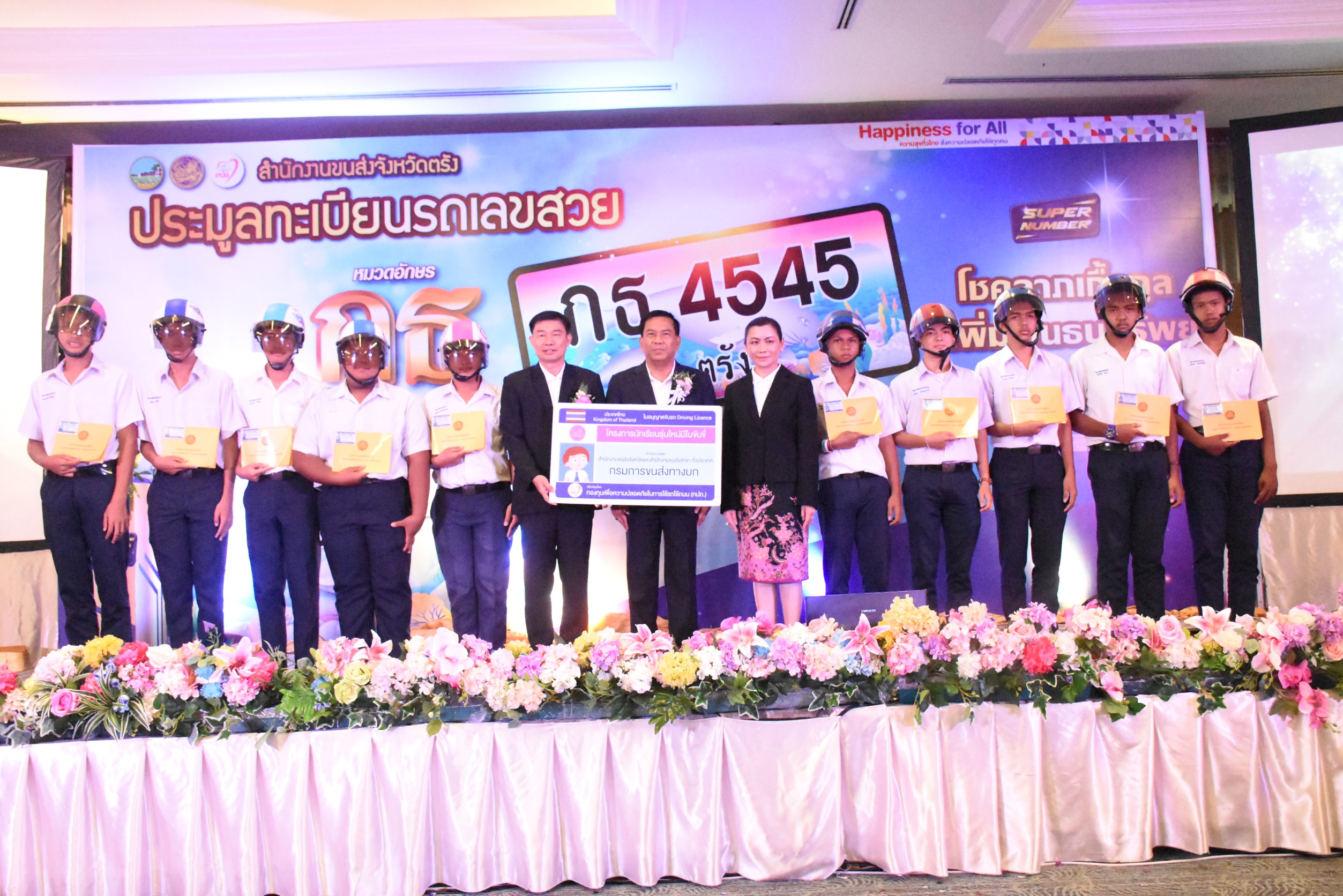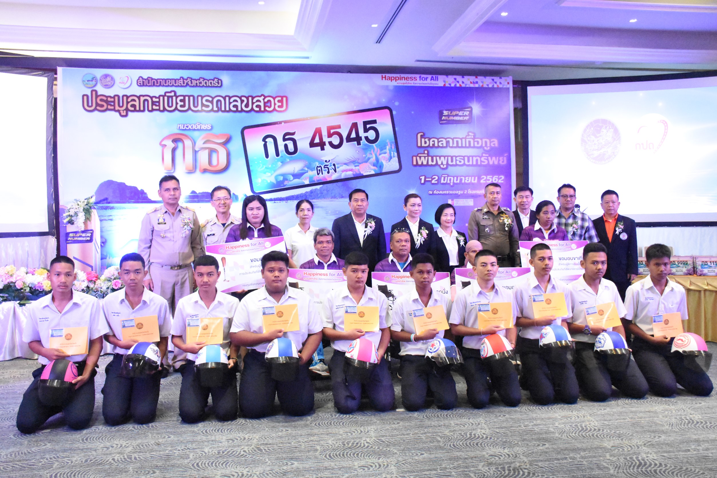 (1 มิ.ย.) นายลือชัย เจริญทรัพย์ ผู้ว่าราชการจังหวัดตรัง เป็นประธานในพิธีเปิดการประมูลหมายเลขทะเบียนรถเลขสวย ครั้งที่ ๗ หมวดอักษร กธ “โชคลาภเกื้อกูล เพิ่มพูนธนทรัพย์” พร้อมมอบอุปกรณ์ช่วยเหลือผู้พิการ จำนวน ๕ ราย และมอบใบอนุญาตขับรถพร้อม ประกาศนียบัตรแก่นักเรียนจำนวน ๑๐ คน และมอบหมวกนิรภัยจำนวน ๑๐ ใบ ตามโครงการนักเรียนรุ่นใหม่มีใบขับขี่ ณ โรงแรมเรือรัษฎา อ.เมืองตรัง