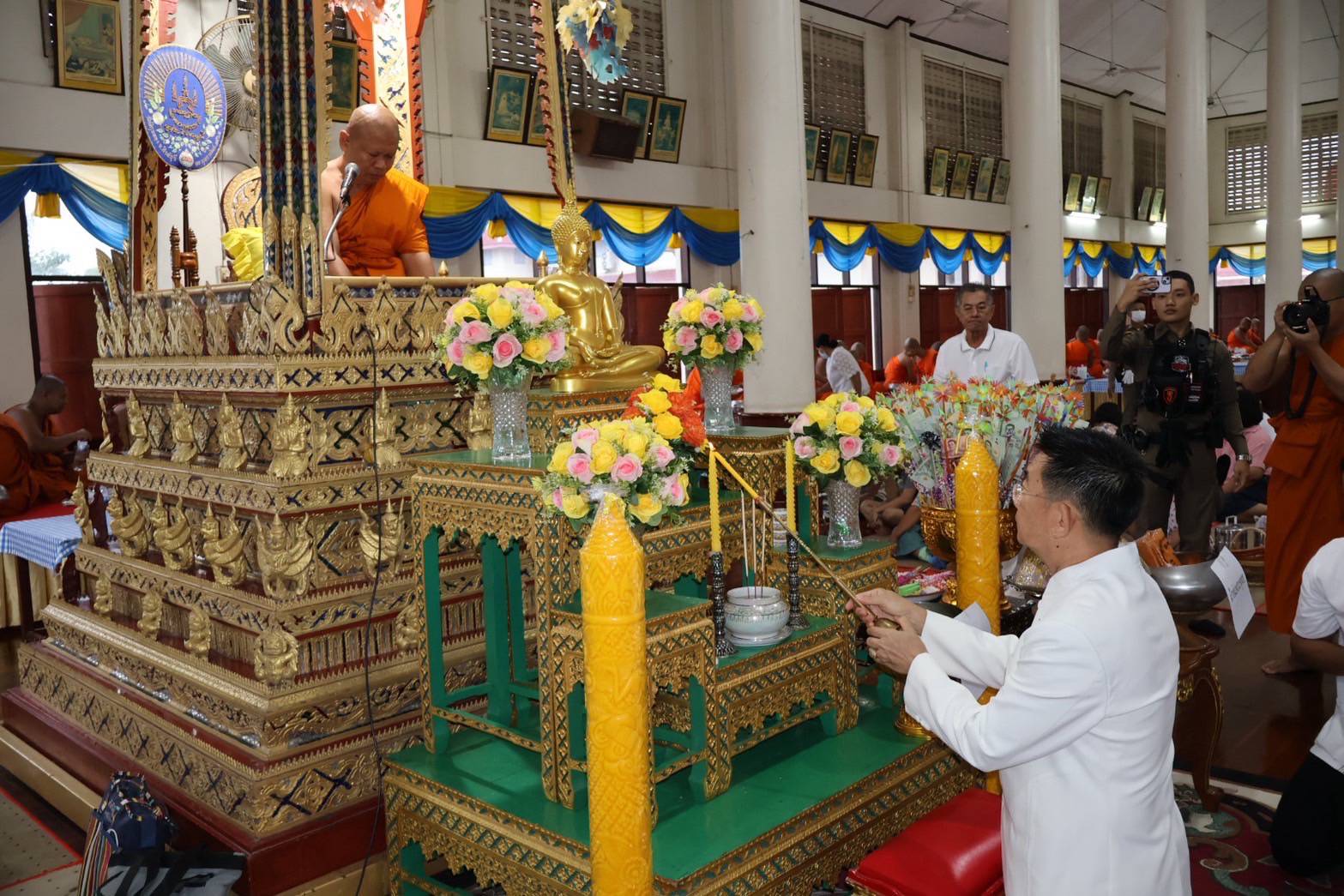 วันที่ 10 กรกฎาคม 2568 เวลา 06.00 น. นายสุเมธ ธีรนิติ ผู้ว่าราชการจังหวัดสิงห์บุรี เป็นประธานพิธีทำบุญตักบาตร ถวายเทียนพรรษา และพิธีเวียนเทียน เนื่องในเทศกาลวันอาสาฬหบูชา และวันเข้าพรรษาพุทธศักราช 2568 โดยมี นางวาสนา ธีรนิติ นายกเหล่ากาชาดจังหวัดสิงห์บุรี นางสาวโสภา กองเนตร นายอำเภอท่าช้าง/นายกกิ่งกาชาดอำเภอท่าช้าง หัวหน้าส่วนราชการ ผู้บริหารท้องถิ่น ข้าราชการ กำนัน ผู้ใหญ่บ้าน เจ้าหน้าที่เหล่ากาชาดจังหวัดสิงห์บุรี และประชาชน เข้าร่วมพิธีดังกล่าว ณ ศาลาการเปรียญ และ พระอุโบสถวัดพิกุลทอง อำเภอท่าช้างจังหวัดสิงห์บุรี
