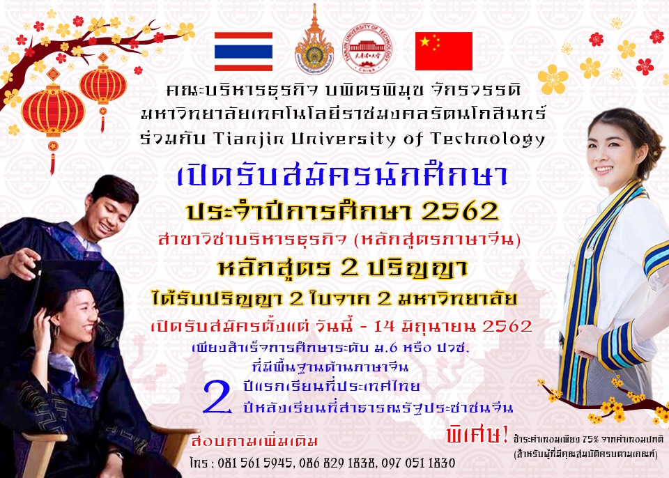 มหาวิทยาลัยเทคโนโลยีราชมงคลรัตนโกสินทร์ (มทร.รัตนโกสินทร์) ร่วมมือ Tianjin University of Technology (TUT) ประเทศจีน เปิดการเรียนการสอนในหลักสูตร“บริหารธุรกิจ โปรแกรมภาษาจีน” หลักสูตรร่วม 2 ปริญญา ศึกษา ณ คณะบริหารธุรกิจ บพิตรพิมุข จักรวรรดิ มทร.รัตนโกสินทร์ 2 ปีแรก และศึกษา ณTianjin University of Technology เมืองเทียนจินประเทศจีน 2 ปี จุดเด่นของหลักสูตรคือนักศึกษาจะได้ทั้งความรู้ด้านบริหารธุรกิจและความรู้และความชำนาญในการใช้ภาษาจีนควบคู่กันไป และจะได้รับปริญญา 2 ปริญญาเมื่อสำเร็จการศึกษาหลักสูตร 2 ปริญญา “บริหารธุรกิจ หลักสูตรภาษาจีน” “มทร.รัตนโกสินทร์ เปิดโอกาสด้านการศึกษาเพื่อรองรับเด็กรุ่นใหม่ที่นอกจากจะสนใจด้านบริหารธุรกิจ ยังให้ความสนใจด้านภาษา ซึ่งนอกเหนือจากภาษาอังกฤษแล้ว ภาษาจีน ยังเป็นอีกหนึ่งภาษาที่กำลังเป็นที่นิยม เพราะจีนเป็นประเทศที่พัฒนา โดยเฉพาะด้านธุรกิจ ดังนั้นจึงเป็นอีกทางเลือกที่บัณฑิตรุ่นใหม่จะสามารถออกไปทำงานต่างประเทศได้ในกลุ่มประชาคมอาเซียน หรือมากกว่านั้นคือการออกไปสู่ประชาคมโลก จึงเกิดหลักสูตรนี้ขึ้นและพัฒนาต่อเนื่องให้เป็นหลักสูตรที่มีความร่วมมือกับมหาวิทยาลัยชั้นนำในต่างประเทศ” นอกจากนี้ มหาวิทยาลัย ยังมีอาจารย์ผู้สอนเป็นคนไทยที่จบปริญญาโทด้านบริหารธุรกิจ และจบปริญญาที่ประเทศจีน 3 คน ซึ่งจะสามารถให้คำแนะนำกับนักศึกษาในหลักสูตรนี้ได้ สำหรับการเรียนการสอนในหลักสูตรนี้ ในระดับชั้นปี 1 จะเรียนได้ที่คณะบริหารธุรกิจ บพิตรพิมุข จักรวรรดิ กับอาจารย์คนไทย ส่วนในระดับชั้นปี 2 จะอาจารย์ชาวจีนจาก “Tianjin University of Technology” มาร่วมสอนด้วย และในระดับปีที่ 3-4 จะเดินทางไปเรียนที่ประเทศจีน“Tianjin University of Technology เป็นอีกหนึ่งมหาวิทยาลัยที่ชื่อเสียงของประเทศจีน เปิดหลักสูตร ระดับปริญญาตรี 63 สาขา ระดับปริญญาโท 66 สาขา อีกทั้งยังเป็นมหาวิทยาลัยสหวิทยาการที่มีวิศวกรรมศาสตร์เป็นพื้นฐาน โดยมีการรวมสาขาวิชาด้านวิทยาศาสตร์ และวิศวกรรมเข้าด้วยกัน และให้ความสำคัญในการพัฒนาสาขาวิชาต่าง ๆ ด้านวิทยาศาสตร์ วิศวกรรมมนุษยศาสตร์ และการบริหารจัดการ สาขาวิชาภาษาจีน ของ Tianjin University of Technology มีการจัดการเรียนการสอนที่โดดเด่นแตกต่างจากประเทศไทย โดยจัดสอนนักศึกษาให้มีความรู้ด้านงานเลขานุการ และการบริหารจัดการด้วย นอกเหนือจากฝึกฝนให้มีความรู้ความสามารถในการใช้ภาษาในโอกาสต่าง ๆ ทั้งนี้ เพื่อให้ผู้สำเร็จการศึกษามีความพร้อมที่จะเข้าสู่วงการธุรกิจและอุตสาหกรรมที่กำลังเติบโตในเมืองเทียนจินประเทศจีน ต่อไปในอนาคต “มทร.รัตนโกสินทร์ หวังว่า ห
