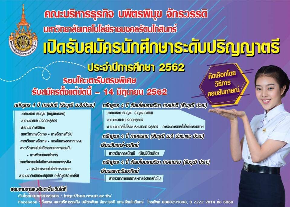 มทร.รัตนโกสินทร์ พื้นที่บพิตรพิมุข จักรวรรดิ เปิดรับนักศึกษาใหม่ ระดับปริญญาตรี ปีการศึกษา 2562 รอบโควตารับตรงพิเศษสมัครตั้งแต่บัดนี้เป็นต้น ไปจนถึงวันที่ 14 มิถุนายน 2562 สอบถามรายละเอียดได้ที่ คณะบริหารธุรกิจ บพิตรพิมุข จักรวรรดิ มหาวิทยาลัยเทคโนโลยีราชมงคลรัตนโกสินทร์ โทร.02-2265925,02-2222814 ต่อ 5350, 5330,5331 หรือดูรายละเอียดได้จากเว็บไซต์ http://bus.rmutr.ac.th รับสมัครถึงวันที่ 14 มิถุนายน 2562 นี้
