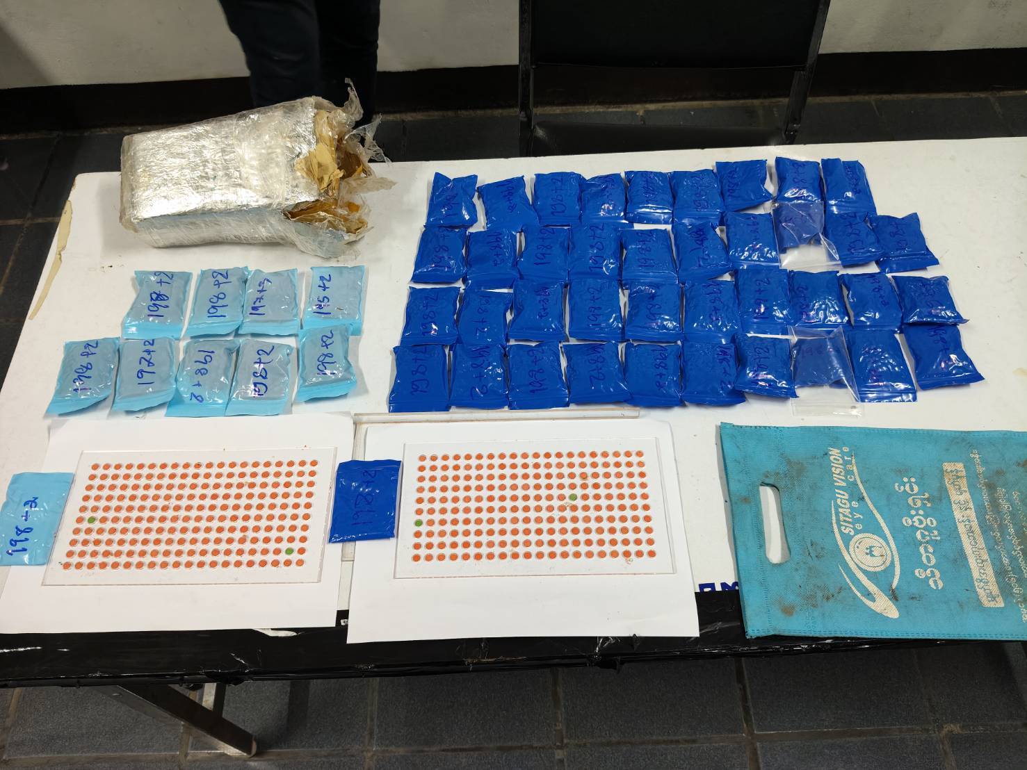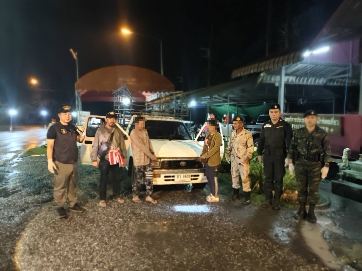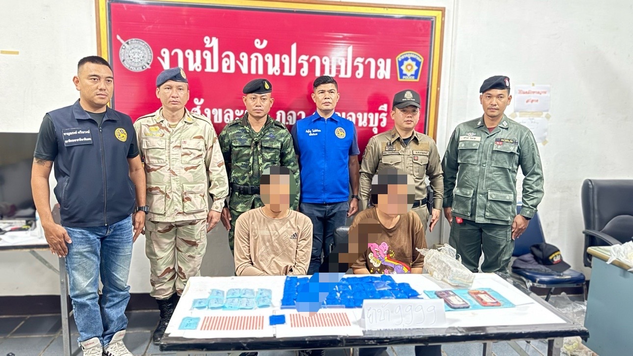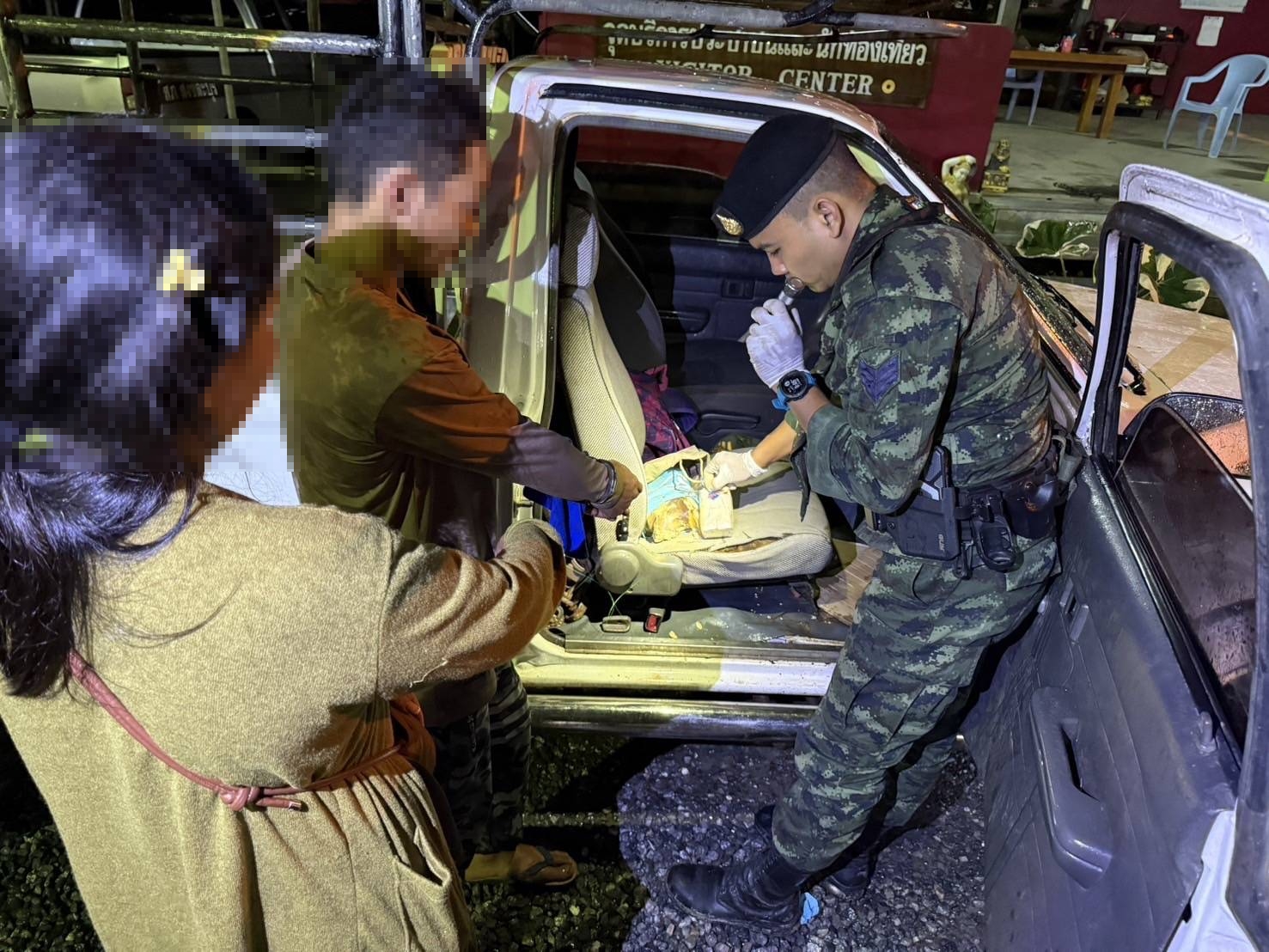 ต่อมา เวลา 21.00 น.ของวันที่ 26 กรกฏาคม 2568 ขณะที่เจ้าหน้าที่ฝ่ายความมั่นคงร่วมกันตั้งจุดตรวจจุดสกัด บริเวณ จุดตรวจร่วมจงอั่ว ตำบลปรังเผล อำเภอสังขละบุรี สังเกตุพบรถยนต์ลักษณะตามที่ได้รับแจ้งจากสายข่าว ขับมาจาก อำเภอสังขละบุรี มุ่งหน้าไป อำเภอทองผาภูมิ จึงได้ให้สัญญาณหยุดรถเพื่อทำการตรวจสอบ พบ นายวีระ ขวัญศิริตะมะ อายุ 31 ปี สัญชาติไทย เป็นผู้ขับขี่รถยนต์กระบะ หมายเลขทะเบียน บว 9800 กาญจนบุรี โดยมี นางวรรณ ไม่มีชื่อสกุล อายุ 26 ปี สัญชาติเมียนมา นั่งรถยนต์คันดังกล่าวมาด้วย ซึ่งในขณะที่เจ้าหน้าที่กำลังทำการซักถามอยู่นั้น สังเกตพฤติการณ์ของ นายวีระฯ แสดงอาการพิรุธชัดเจน เจ้าหน้าที่จึงได้ทำการตรวจค้นทั่วบริเวณรถอย่างละเอียด สังเกตพบประตูฝั่งคนขับมีลักษณะคล้ายถูกดัดแปลง จึงได้ทำการตรวจสอบ พบ ยาบ้า จำนวน 9,999 เม็ด บรรจุอยู่ภายในถุงพลาสติกสีฟ้า จำนวน10 ห่อ และถุงพลาสติก