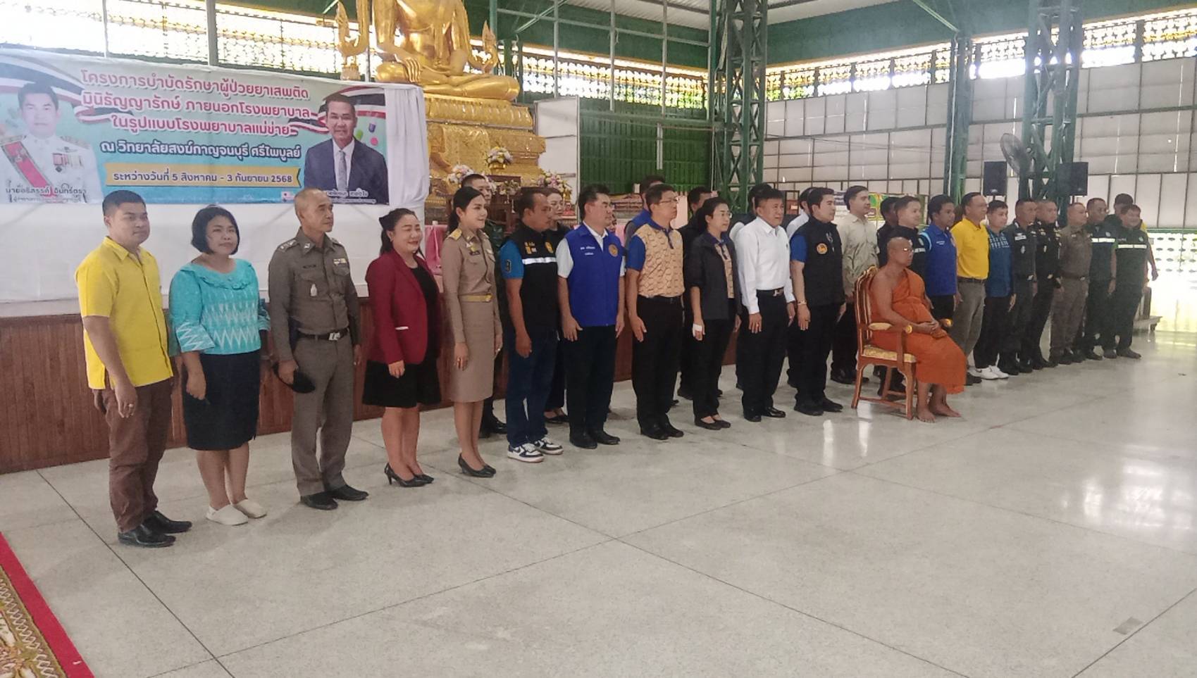 โดนมี นายธีรพจน์ ฟักน้อย นายแพทย์สาธารณสุขจังหวัดกาญจนบุรี กล่าวรายงานวัตถุประสงค์ ตามที่จังหวัดกาญจนบุรี เป็น 1 ใน 8 จังหวัดนำร่อง ซึ่งเกิดจากความร่วมมือระหว่างกระทรวงสาธารณสุข กระทรวงมหาดไทย สำนักงานตำรวจแห่งชาติและองค์กรปกครองส่วนท้องถิ่นที่ได้ดำเนินการแก้ไขปัญหายาเสพติดในพื้นที่เร่งด่วย เพื่อเป็นแนวทางการจัดต้ังและพัฒนาระบบบริการในรูปแบบมินิธัญญารักษ์นอกโรงพยาบาล ตลอดจนเพื่อพัฒนาศักยภาพของโรงพยาบาลชุมชนในการดูแลผู้ป่วยยาเสพติดและผุ้ป่วยจิตเวชจากการใช้ยาเสพติด และลดอัตราการส่งต่อผู้ป่วยไปยังโรงพยาบาลและเข้าถึงการบริการที่มีความจำเป็นเหมาะสมสำหรับผู้ติดยาเสพติดและผู้ป่วยขิตเวชจากการใช้ยาเสพติด โดยเน้นย้ำถึงความสำคัญของการบูรณาการระหว่างภาครัฐ ภาคศาสนา และภาคประชาชน ในการดูแลผู้ติดยาเสพติดให้สามารถกลับคืนสู่สังคมได้อย่างมีคุณภาพ โครงการ “มินิธัญญารักษ์นอกสถานพยาบาล” เป็นแนวทางใหม่ที่เน้นการบำบัดฟื้นฟูในพื้นที่ชุมชน โดยใช้หลักธรรมทางศาสนาและการแพทย์ควบคู่กัน เพื่อสร้างสภาพแวดล้อมที่เอื้อต่อการฟื้นฟูจิตใจและร่างกายของผู้เข้ารับการบำบัด โดยมีผู้เข้ารับการบำบัดรักษาจาก13 อำเภอในจังหวัดกาญจนบุรี รวมท้ังสิ้น 100 คน ระยะเวลาระหว่างวันที่ 5 สิงหาคม ถึง 3 กันยายน 2568