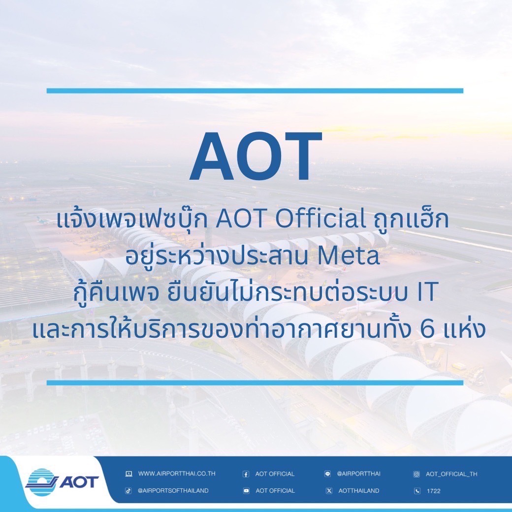AOT แจ้งเพจเฟซบุ๊ก AOT Official ถูกแฮ็ก อยู่ระหว่างประสาน Meta กู้คืนเพจ ยืนยันไม่กระทบต่อระบบ IT และการให้บริการของท่าอากาศยานทั้ง 6 แห่ง