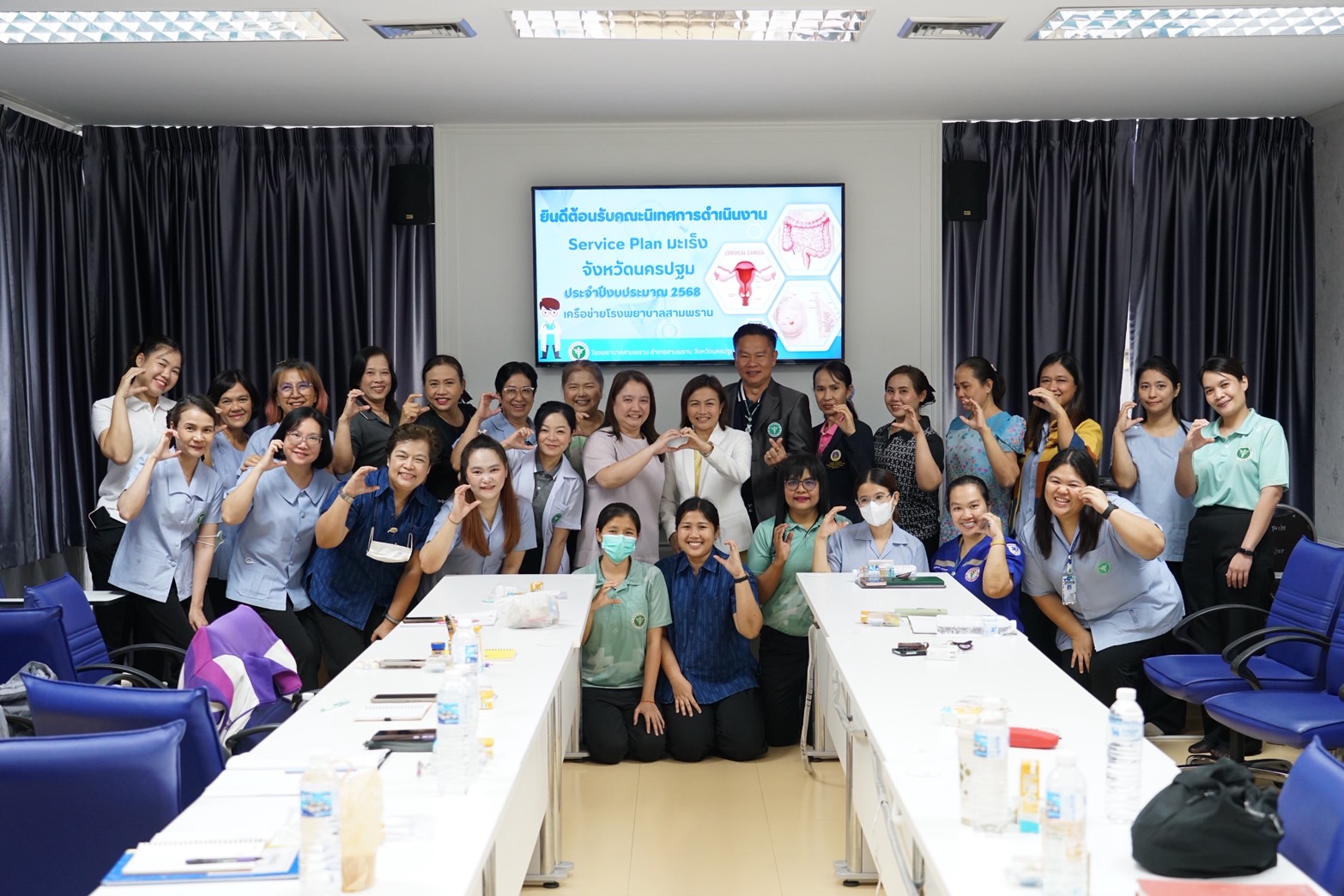 ซึ่งมี พญ.อัญชนา มณีงาม รองผอ.รพ.สามพราน นางพัชรี เกษรบุญนาค รองผอ.รพ.สามพราน และเจ้าหน้าที่รับผิดชอบงานมะเร็ง ให้การต้อนรับ