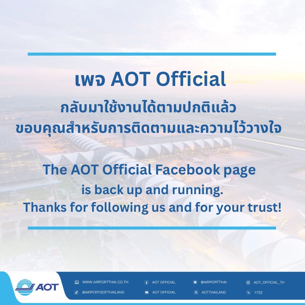 เพจ AOT Official กลับมาใช้งานได้ตามปกติแล้ว AOT ขอขอบคุณสำหรับความไว้วางใจและการติดตามอย่างต่อเนื่อง กดติดตามได้เลยที่ www.facebook.com/AOTofficial เพื่อไม่ให้พลาดข่าวสารของ AOT เรายังคงมุ่งมั่นที่จะส่งมอบประสบการณ์เดินทางที่ดีที่สุดให้กับทุกท่าน
