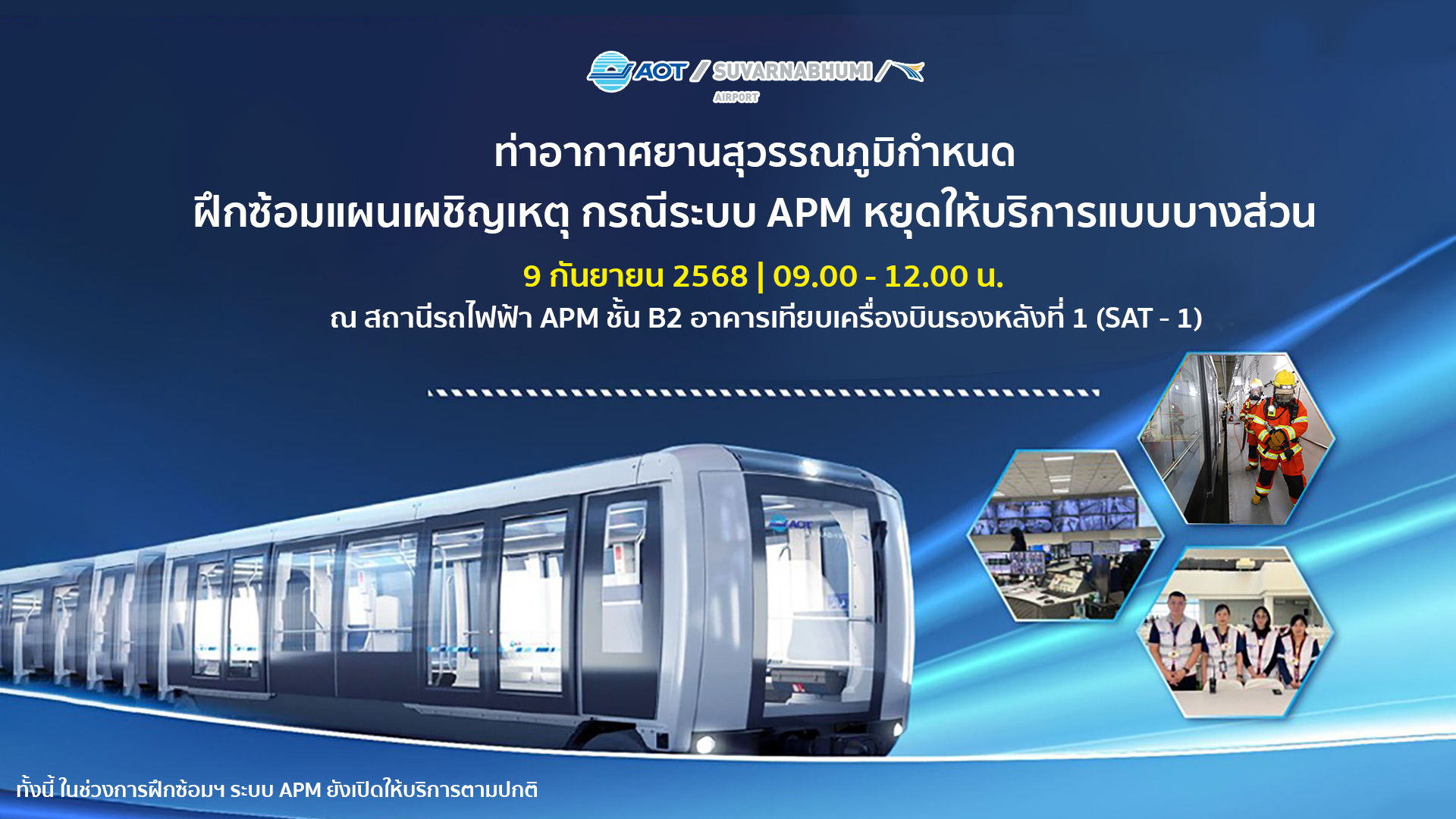 แผนเผชิญเหตุกรณีระบบขนส่งผู้โดยสารอัตโนมัติ (APM) หยุดให้บริการแบบบางส่วน (APM Partial Exercise) ประจำปีงบประมาณ 2568 ในวันอังคารที่ 9 กันยายน 2568 ระหว่างเวลา 09.00 – 12.00 น. ณ สถานีรถไฟฟ้า APM ชั้น B2 อาคารเทียบเครื่องบินรองหลังที่ 1 (SAT – 1) เพื่อเตรียมความพร้อมการบูรณาการด้านปฏิบัติงาน