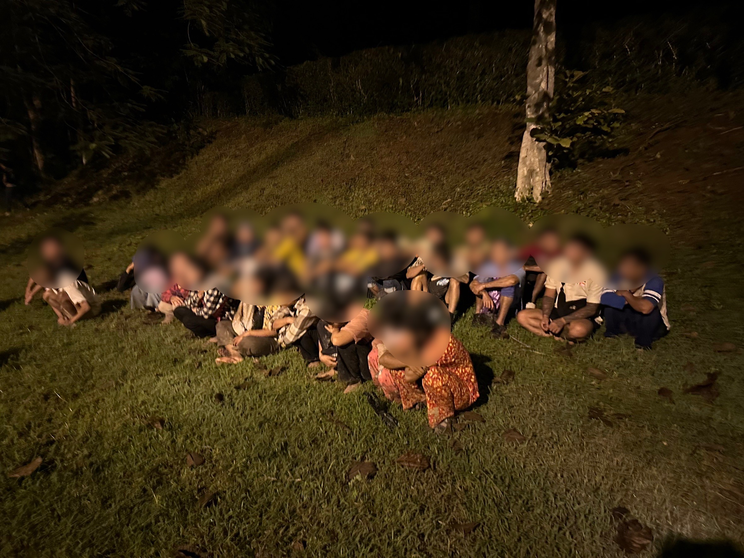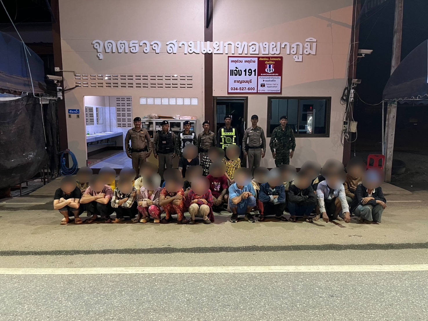 ต่อมาเวลา 02.00 น. ขณะที่เจ้าหน้าที่ฝ่ายความมั่นคงร่วมกันตั้งจุดตรวจจุดสกัด บริเวณ จุดตรวจร่วมหน้าเขื่อนวชิราลงกรณ ต.ท่าขนุน อ.ทองผาภูมิ จ.กาญจนบุรี สังเกตพบรถยนต์ต้องสงสัย ขับมาจาก ต.ห้วยเขย่ง อ.ทองผาภูมิ มุ่งหน้า อ.เมืองกาญจนบุรี จึงได้ให้สัญญาณหยุดรถเพื่อทำการตรวจสอบ แต่ผู้ขับขี่ได้เร่งเครื่องยนต์หลบหนี เจ้าหน้าที่จึงได้เร่งติดตามอย่างกระชั้นชิด กระทั่งสามารถสกัดจับรถยนต์คันดังกล่าวได้ที่ บริเวณ ทางหลวงหมายเลข 3272 ใกล้เคียงกับกองบังคับการหน่วยเฉพาะกิจลาดหญ้า ม.1 ต.ท่าขนุน อ.ทองผาภูมิ จ.กาญจนบุรี ต่อมาเจ้าหน้าที่จึงได้ทำการตรวจสอบอย่างละเอียด พบ รถยนต์ 7 ที่นั่ง หมายเลขทะเบียน กร 1780 กาญจนบุรี ซึ่งผู้ขับขี่ได้ทิ้งรถยนต์คันดังกล่าวไว้ริมถนนและหลบหนีไป ภายในรถยนต์พบบุคคลต่างด้าวผิดกฎหมาย สัญชาติเมียนมา จำนวน 28 คน (ชาย 19 คน และหญิง 9 คน) ซึ่งทั้งหมดไม่สามารถสื่อสารภาษาไทย และไม่มีเอกสารประจำตัวที่ทางราชการออกให้ เจ้าหน้าที่จึงได้ควบคุมตัวไว้ทั้งหมด
