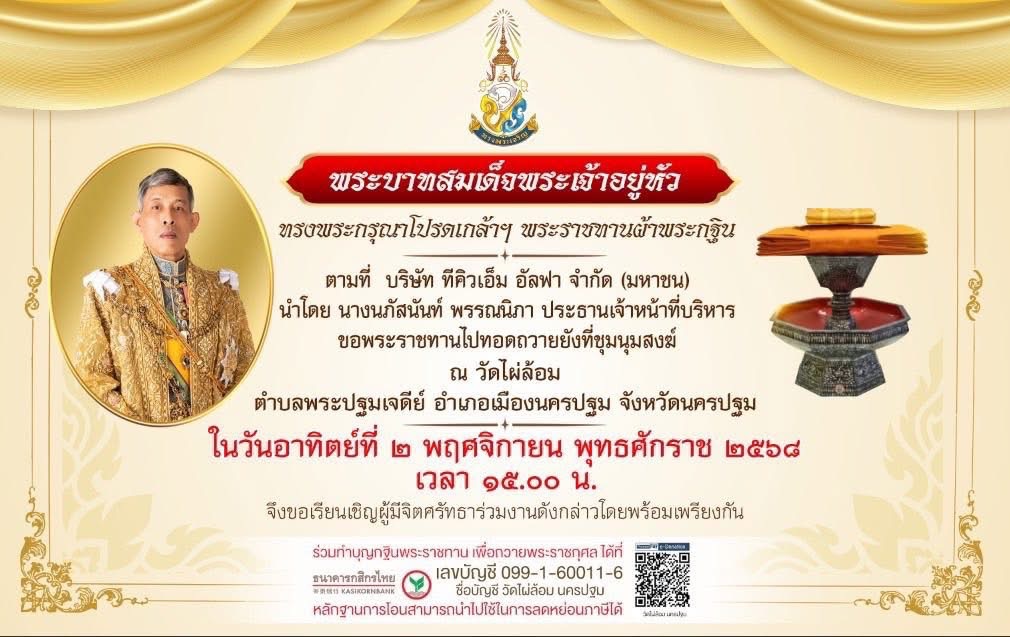 ด้วย พระบาทสมเด็จพระเจ้าอยู่หัว ทรงพระกรุณาโปรดเกล้าฯ พระราชทานผ้าพระกฐิน ตามที่ บริษัท ทีคิวเอ็ม อัลฟา จำกัด (มหาชน) นำโดย นางนภัสนันท์ พรรณนิภา ประธานเจ้าหน้าที่บริหาร ขอพระราชทานไปทอดถวายยังที่ชุมนุมสงฆ์ ณ วัดไผ่ล้อม พระอารามหลวง ตำบลพระปฐมเจดีย์ อำเภอเมืองนครปฐม จังหวัดนครปฐม ในวันอาทิตย์ที่ 2 พฤศจิกายน พ.ศ.2568 เวลา 15.00 น.